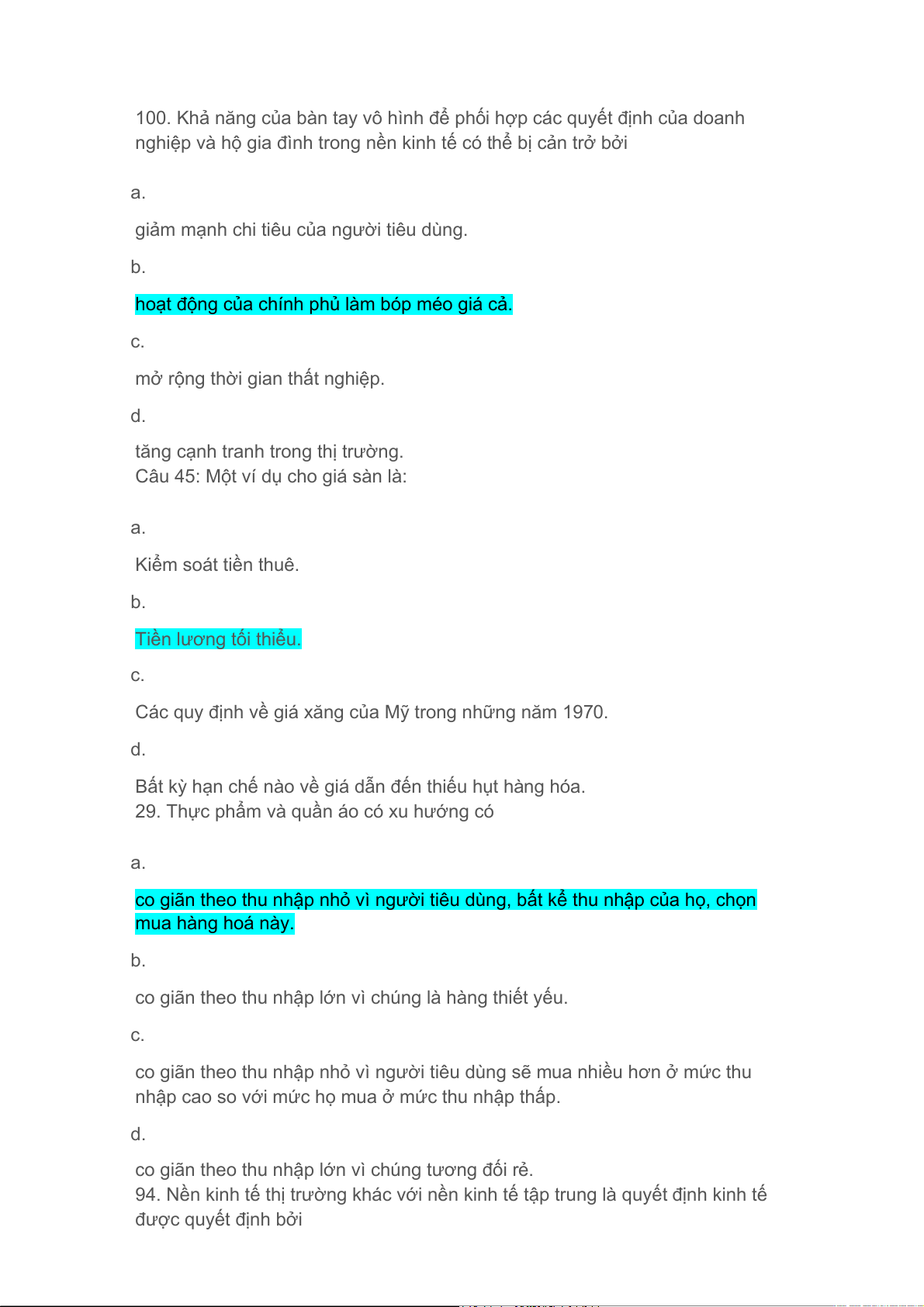 Câu 45: Một ví dụ cho giá sàn là: a. Kiểm soát tiền thuê. b. Tiền lương tối thiểu. c.
