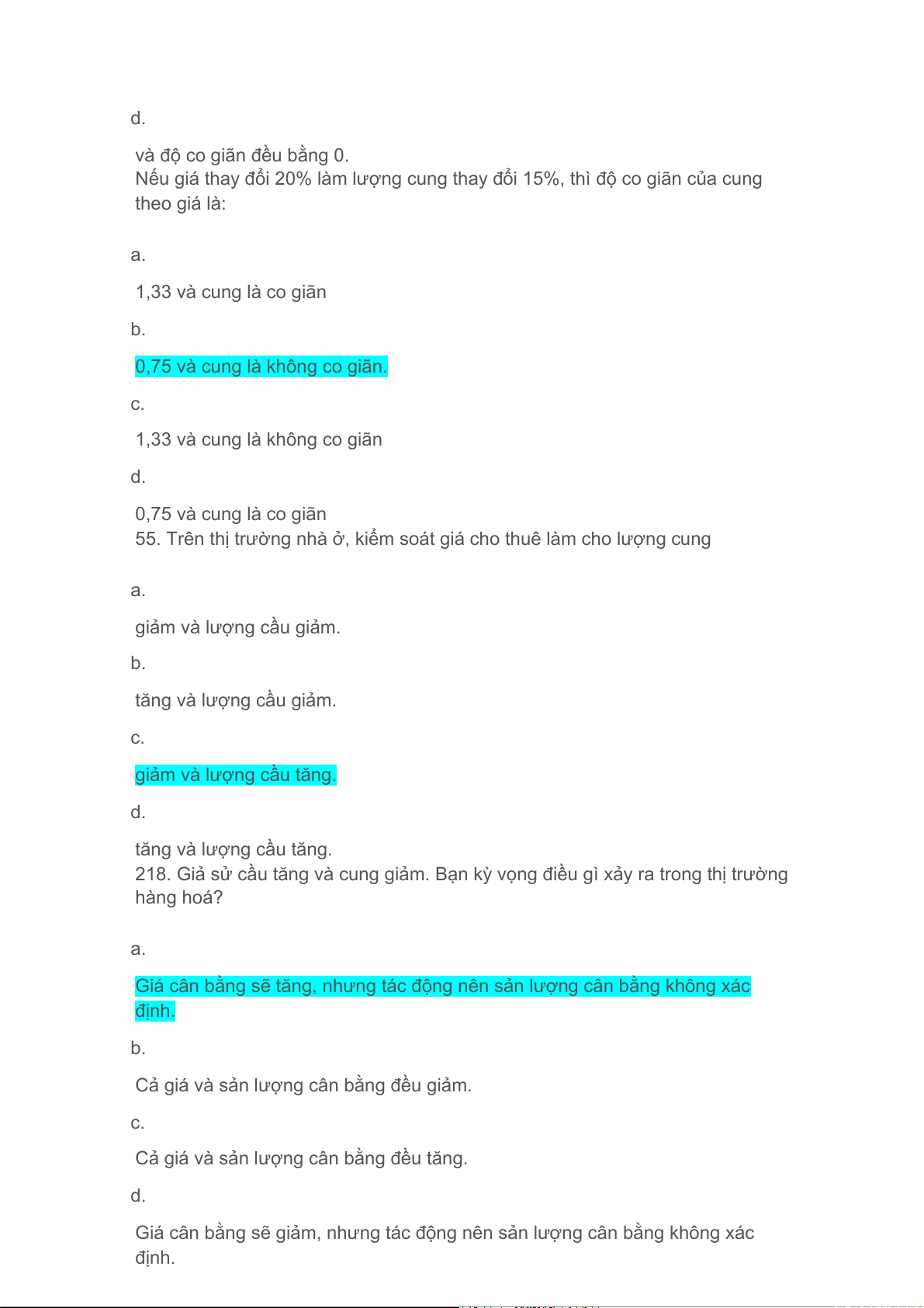 218. Giả sử cầu tăng và cung giảm. Bạn kỳ vọng điều gì xảy ra trong thị trường hàng hoá? a.