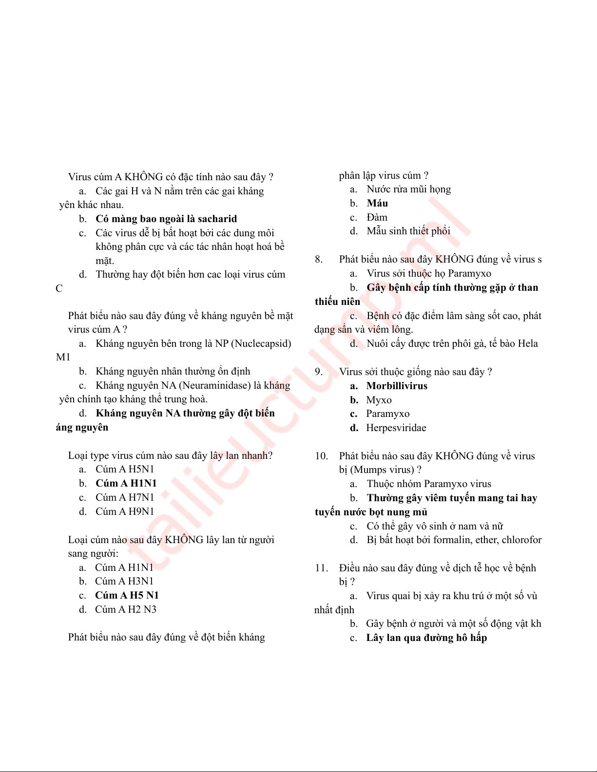 10. Phát biểu nào sau đây KHÔNG đúng về virus quai a. Cúm A H5N1 bị (Mumps virus) ? b. Cúm A H1N1