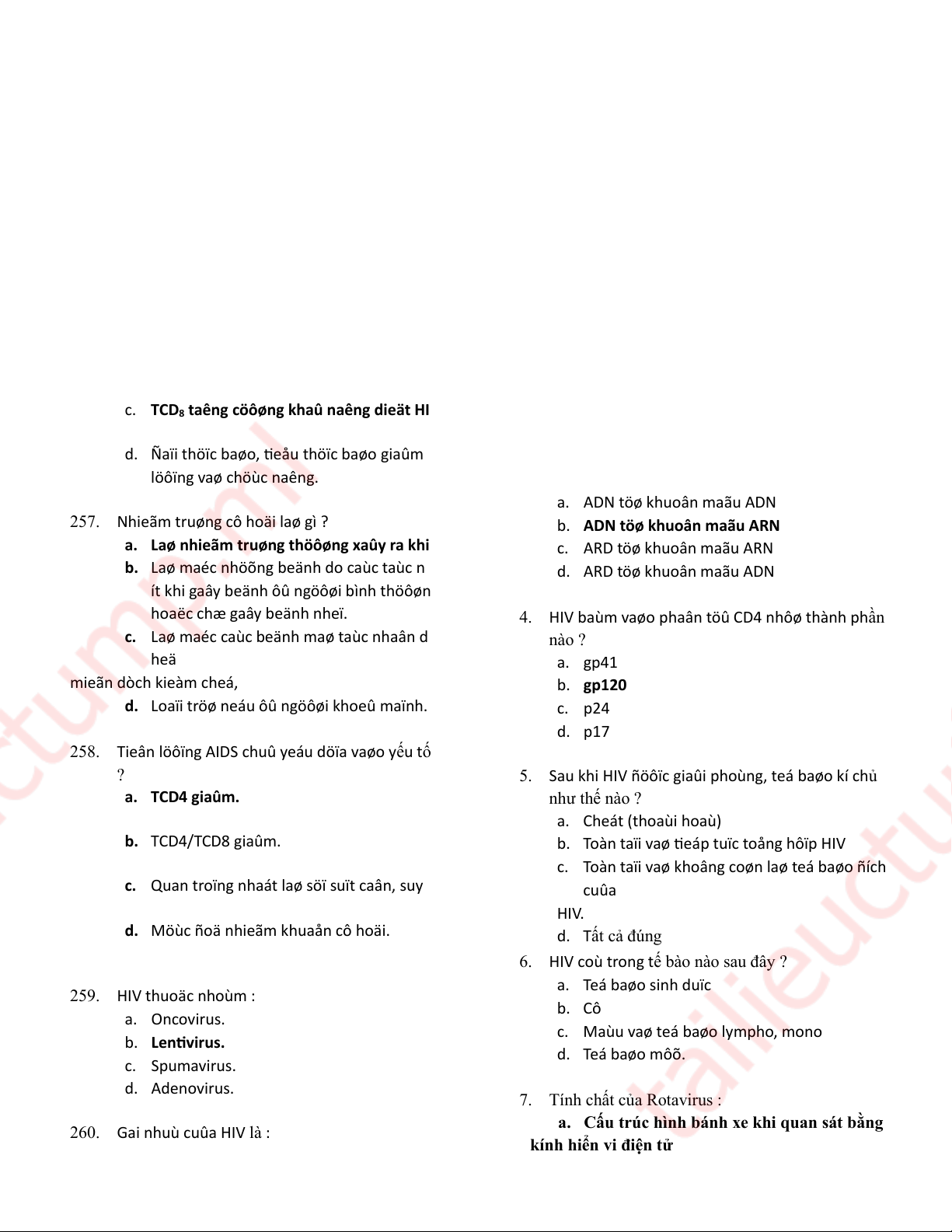 266. HIV coù trong tế bào nào sau đây ? a. Teá baøo sinh duïc 259. HIV thuoäc nhoùm : b. Cô a. Oncovirus.