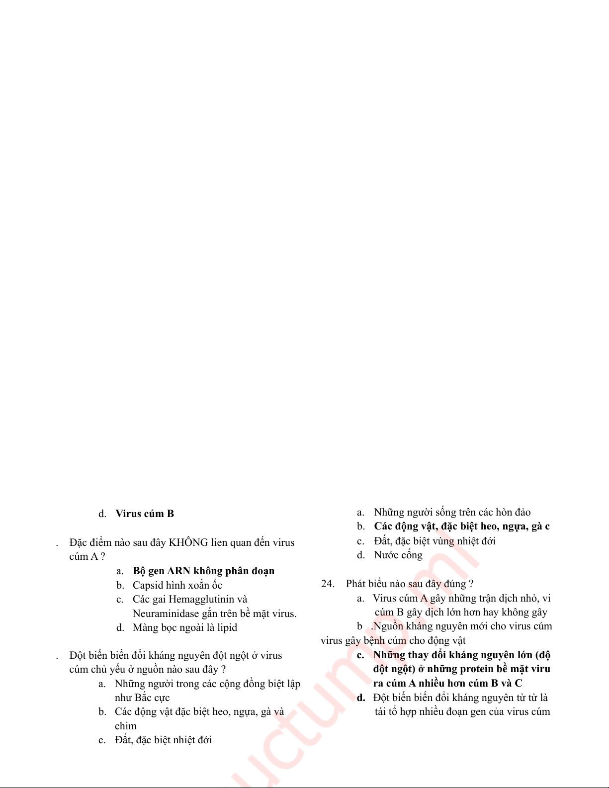 23. Đột biến kháng nguyên đột ngột ở virus cúm là chủ c. Virus á cúm yếu ở nguồn nào? d. Virus cúm B