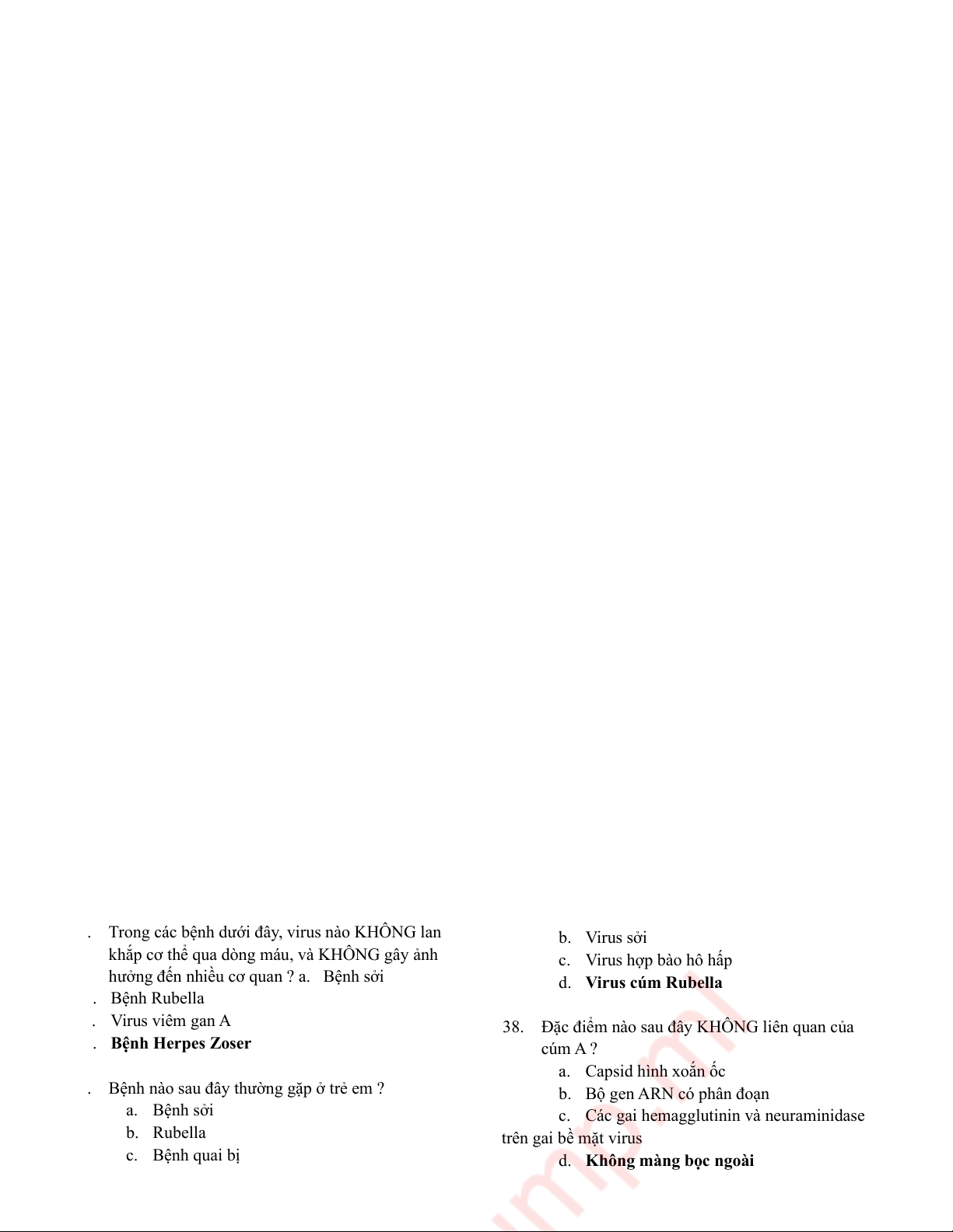 14. Điểm nào sau đây KHÔNG là điểm khác nhau của b. Paramyxovirus Rubella và virus sởi ? c. Papovavirus