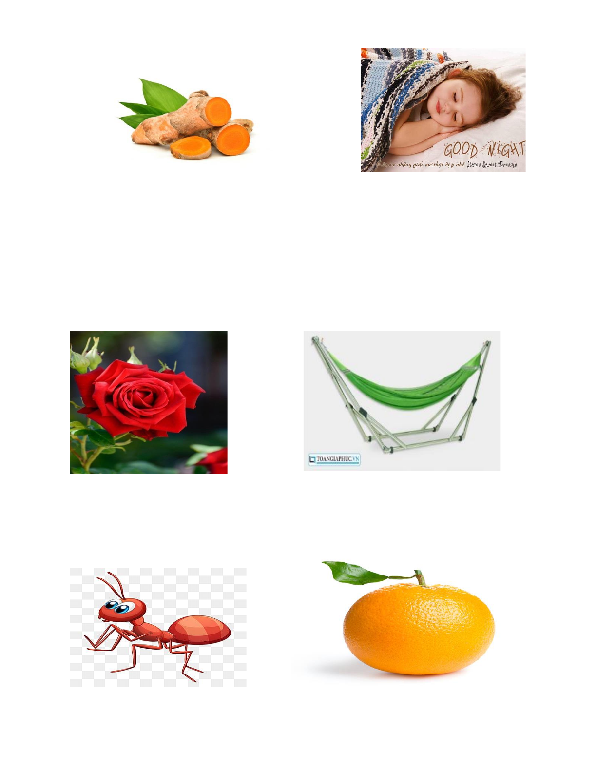 Tiếng, từ: Quả cam, bé gái, đi học, đôi dép, củ lạc, cây bàng, nải chuối, màu xanh
