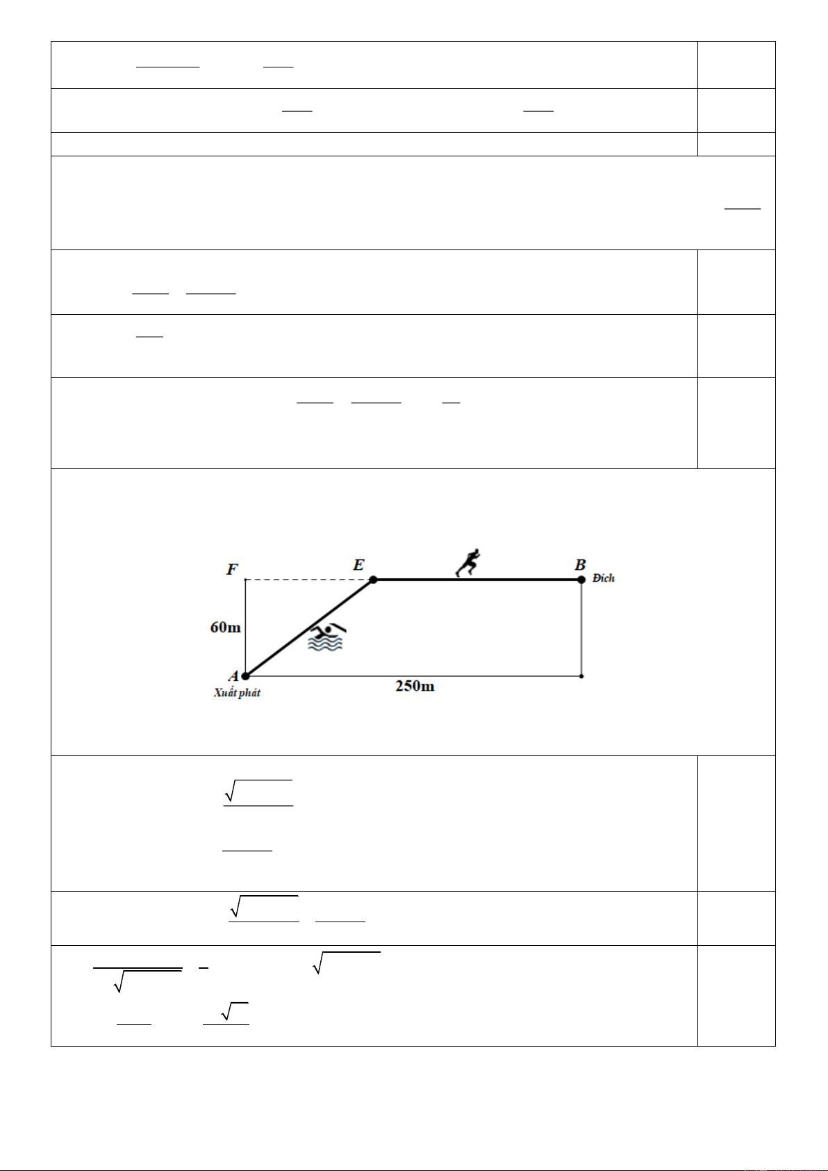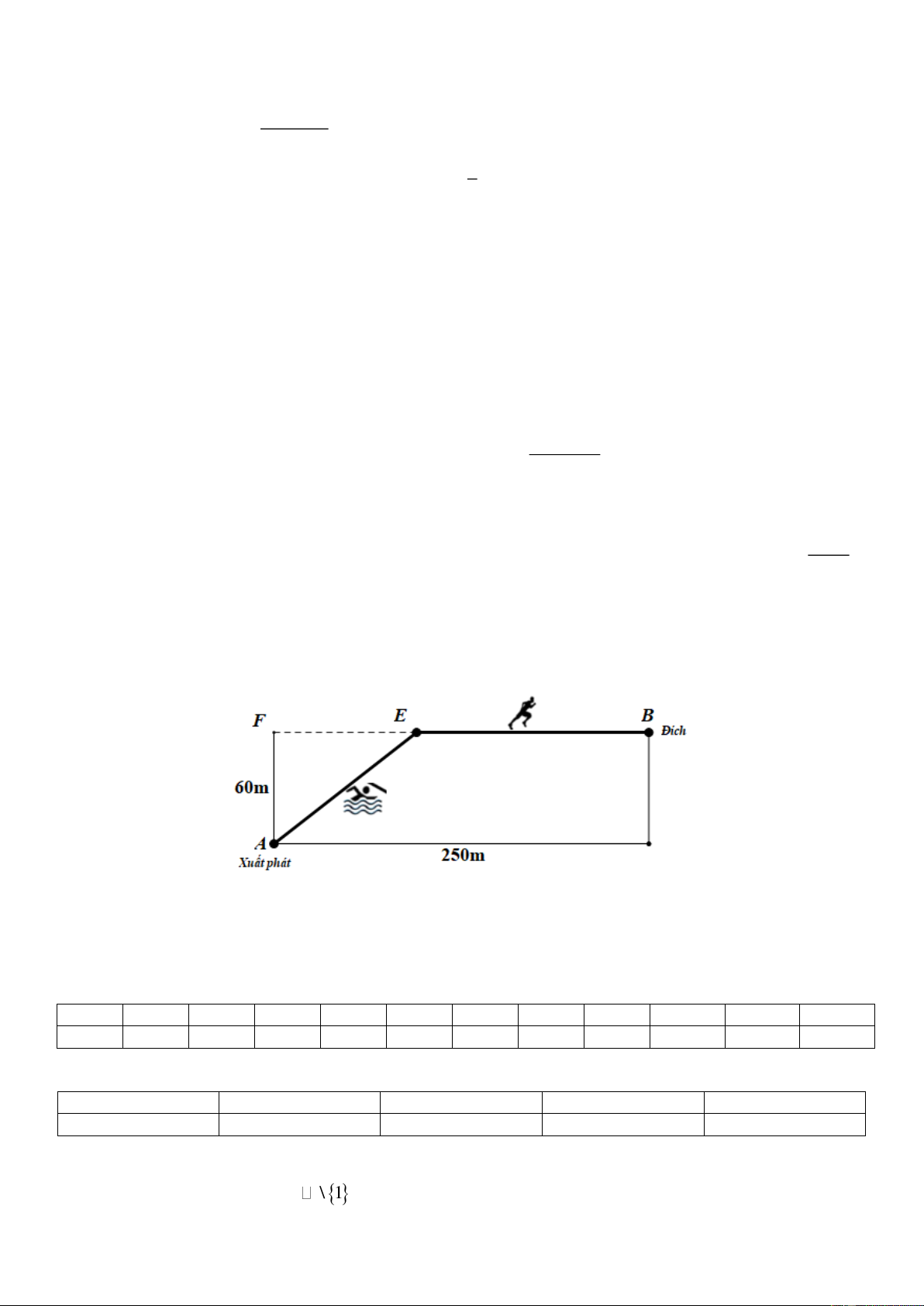 thập phân) để đến đích nhanh nhất, biết rằng vận tốc bơi là 1,5 m/s, vận tốc chạy là 4 m/s. Gọi EF = x 2 2 x + 60