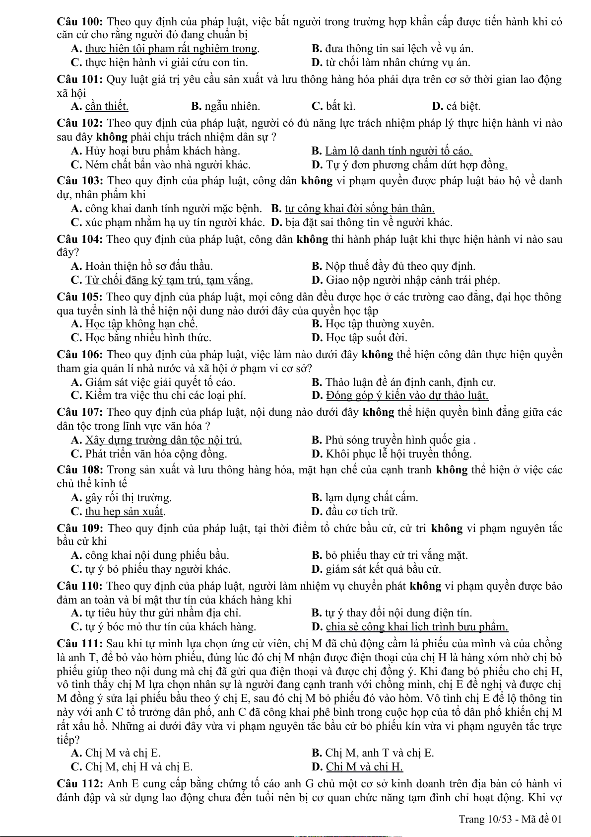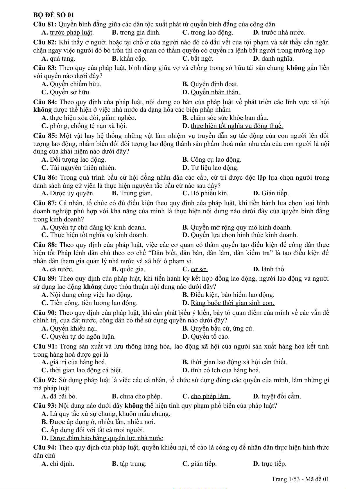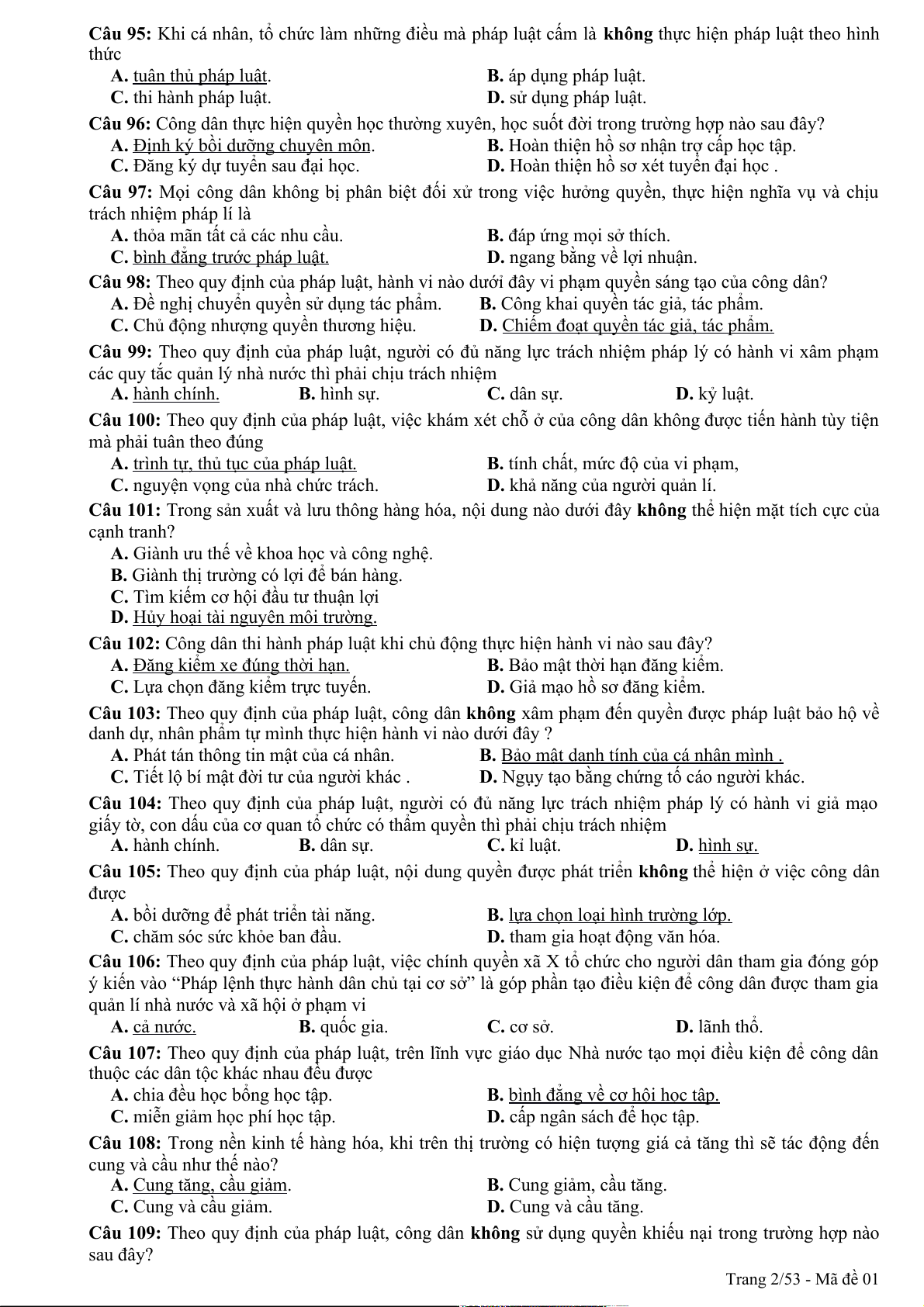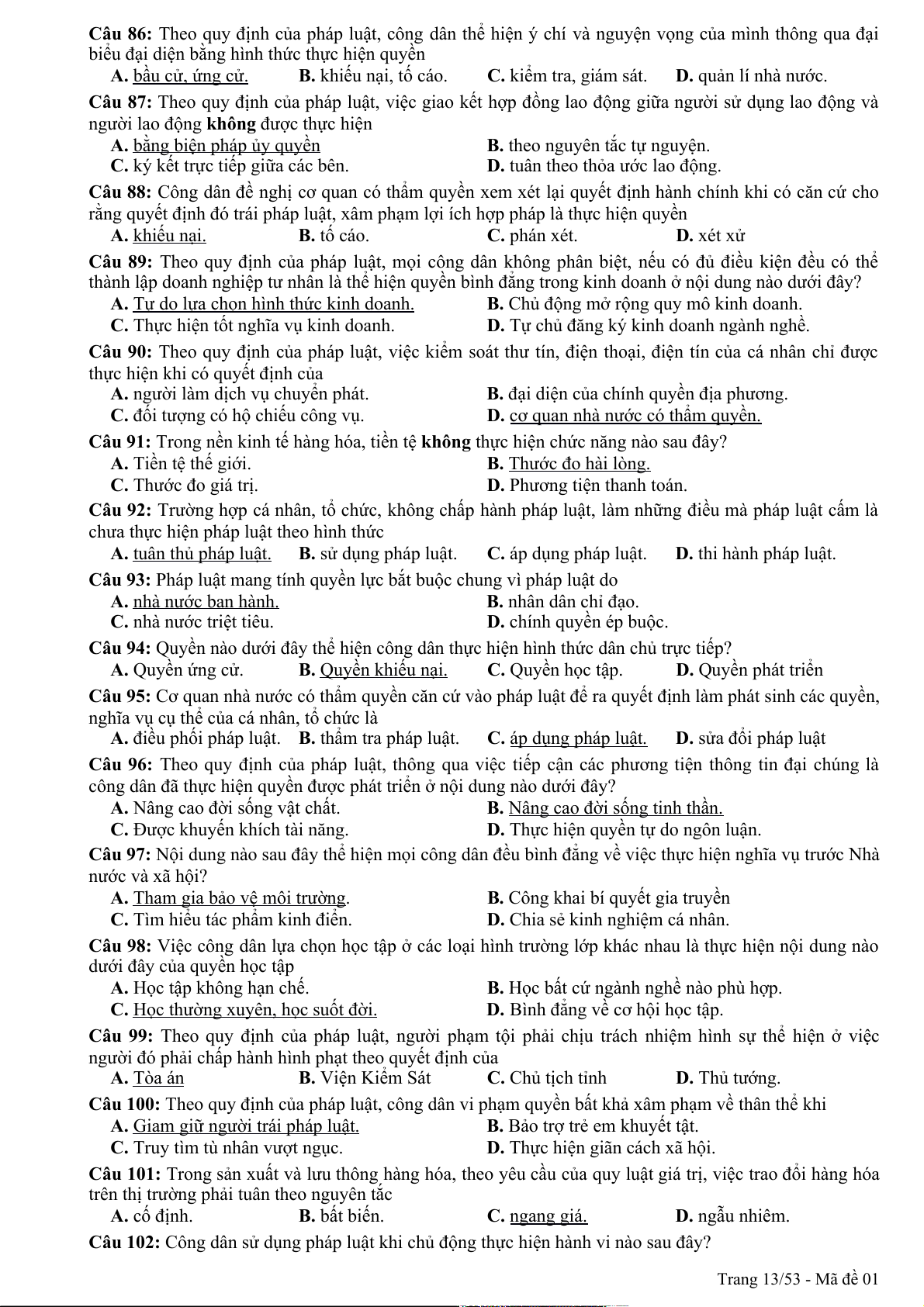 Câu 94: Theo quy định của pháp luật, quyền khiếu nại, tố cáo là công cụ để nhân dân thực hiện hình thức dân chủ A. chỉ định. B. tập trung. C. gián tiếp. D. trực tiếp. Trang 1/53 - Mã đề 01