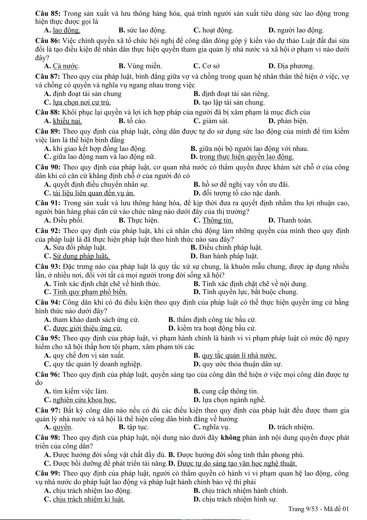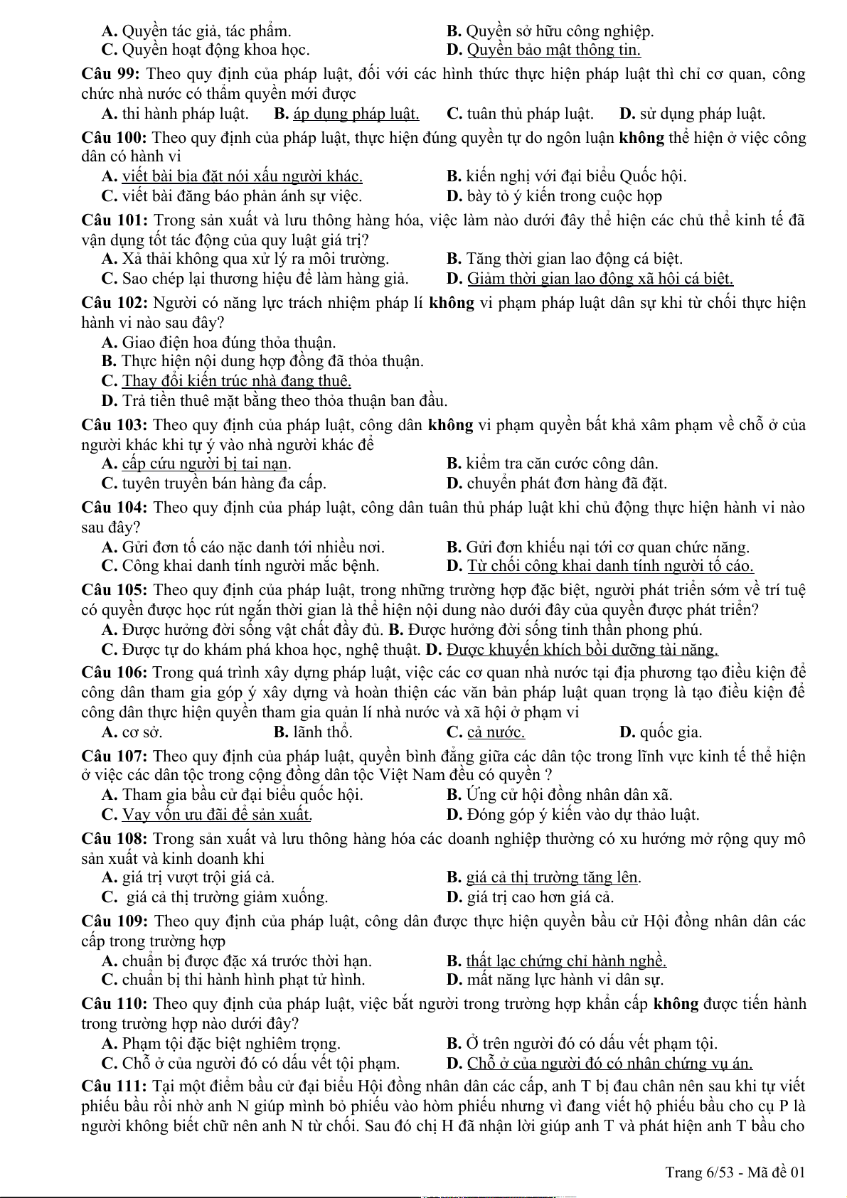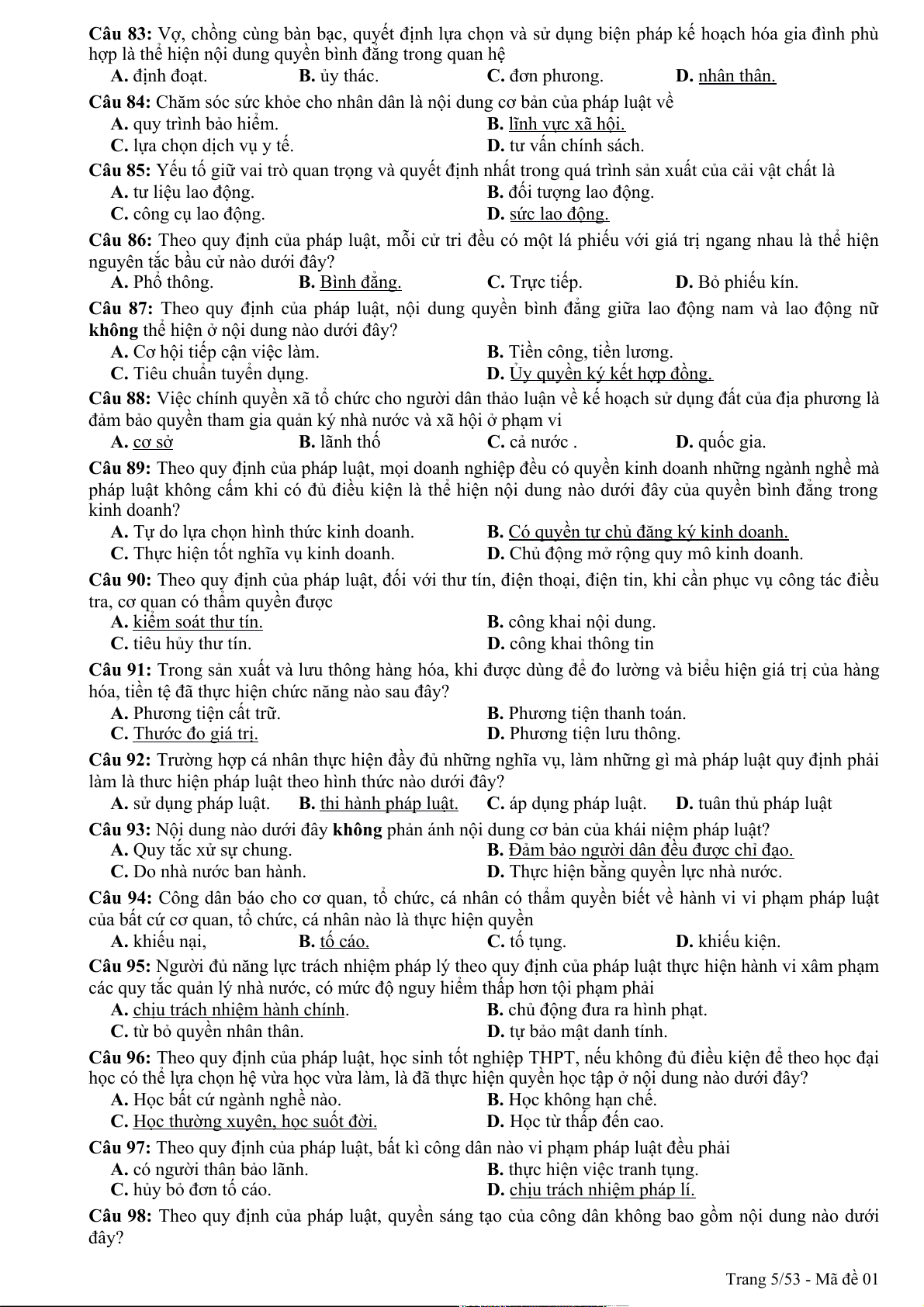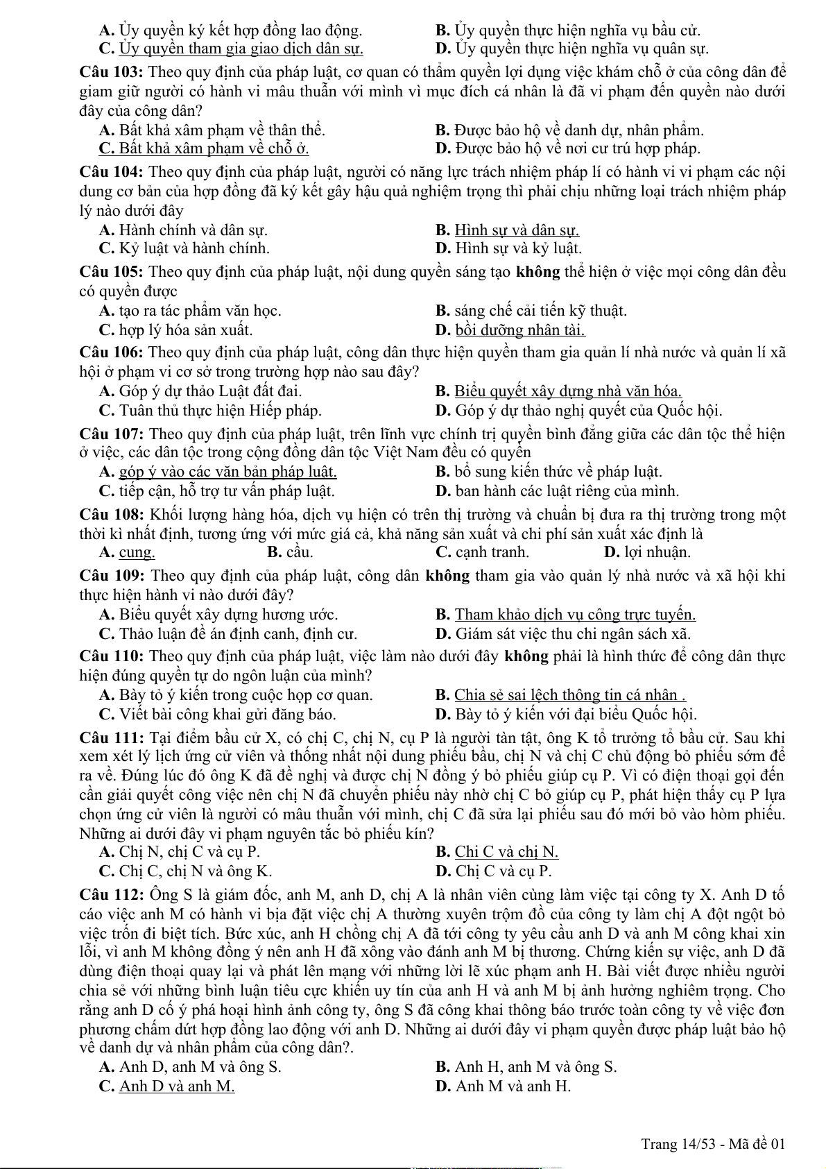 Câu 94: Theo quy định của pháp luật, quyền khiếu nại, tố cáo là công cụ để nhân dân thực hiện hình thức dân chủ A. chỉ định. B. tập trung. C. gián tiếp. D. trực tiếp. Trang 1/53 - Mã đề 01