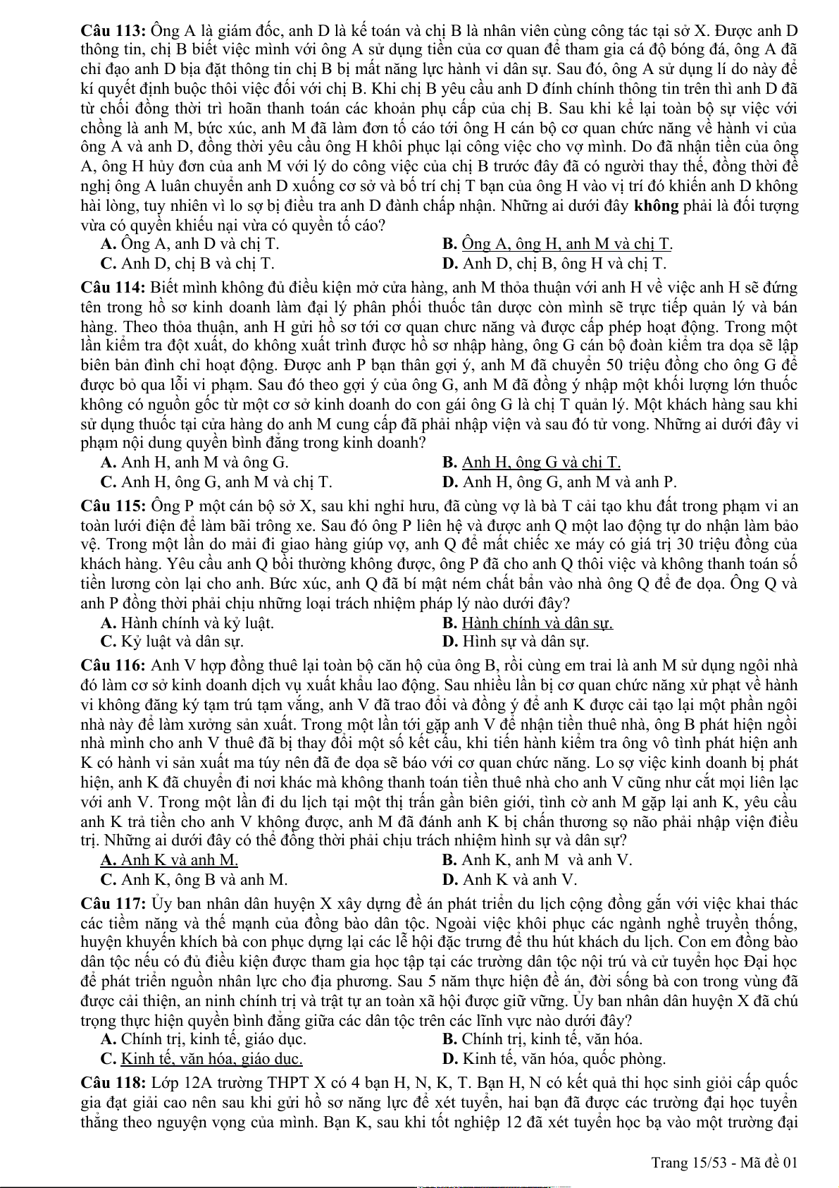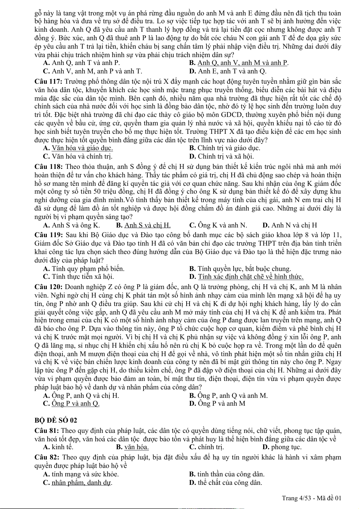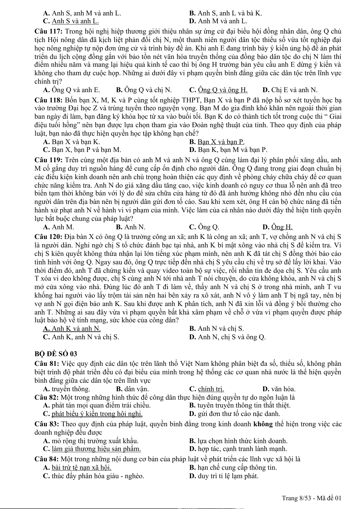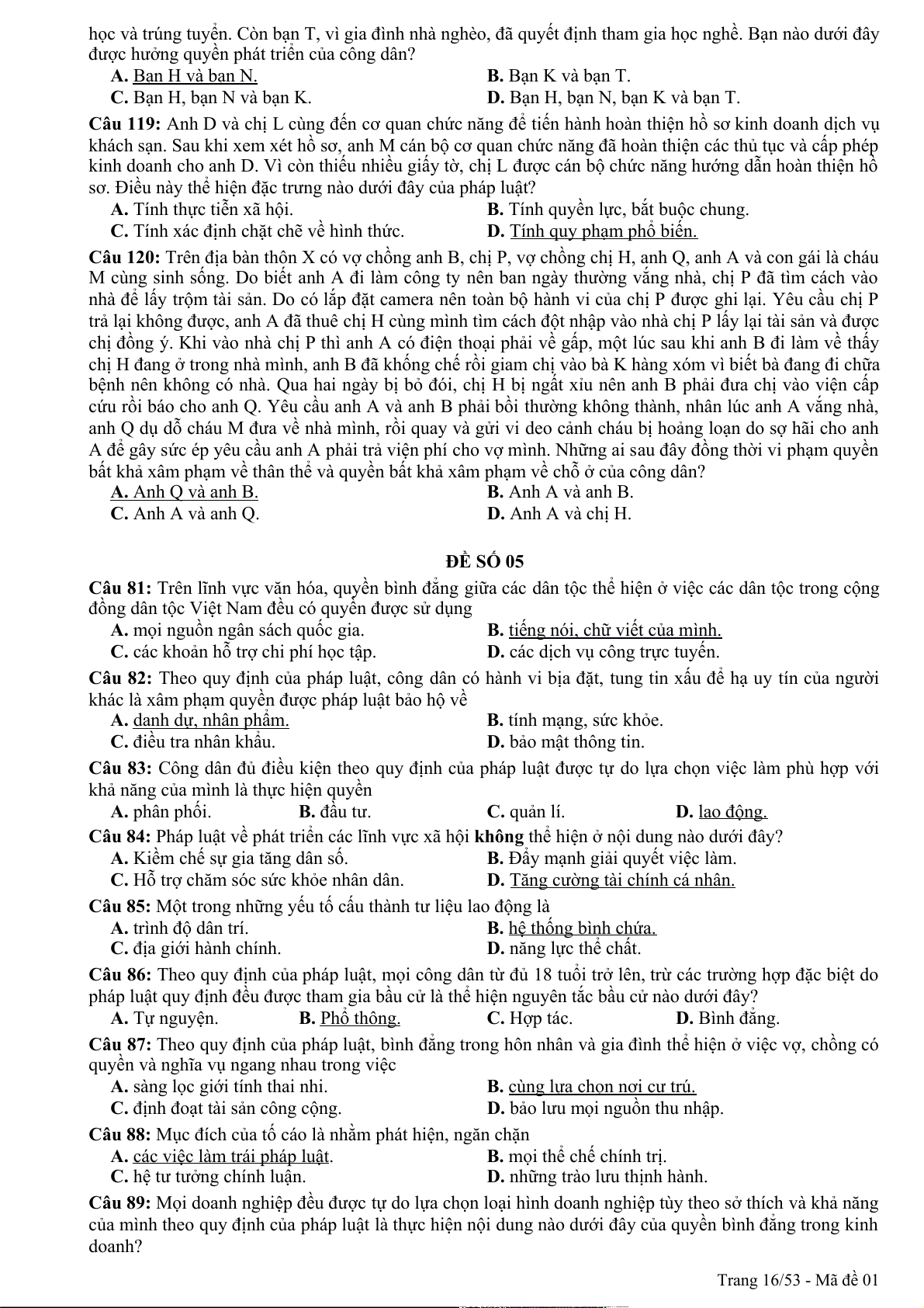 Câu 94: Theo quy định của pháp luật, quyền khiếu nại, tố cáo là công cụ để nhân dân thực hiện hình thức dân chủ A. chỉ định. B. tập trung. C. gián tiếp. D. trực tiếp. Trang 1/53 - Mã đề 01