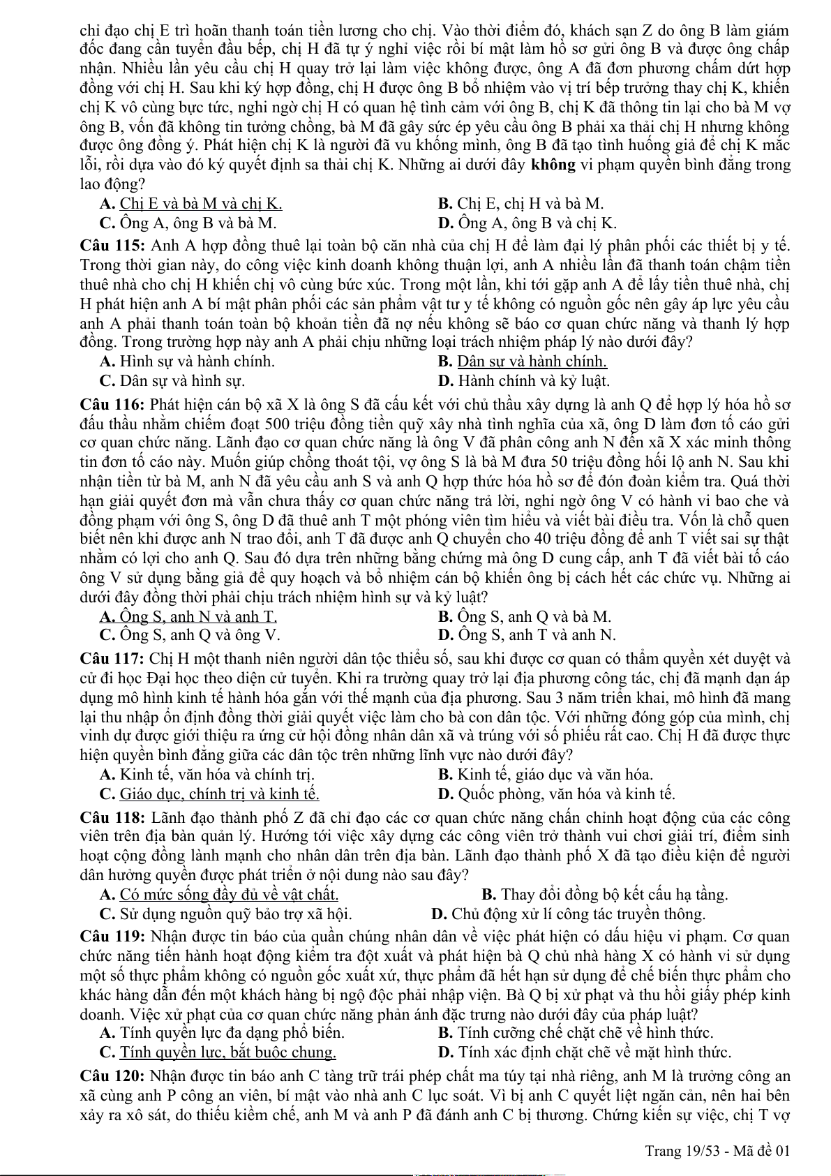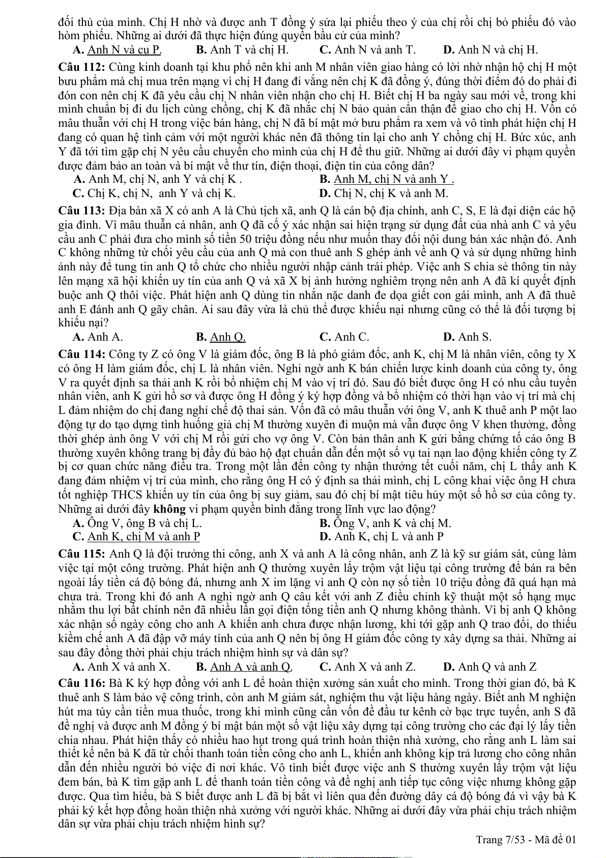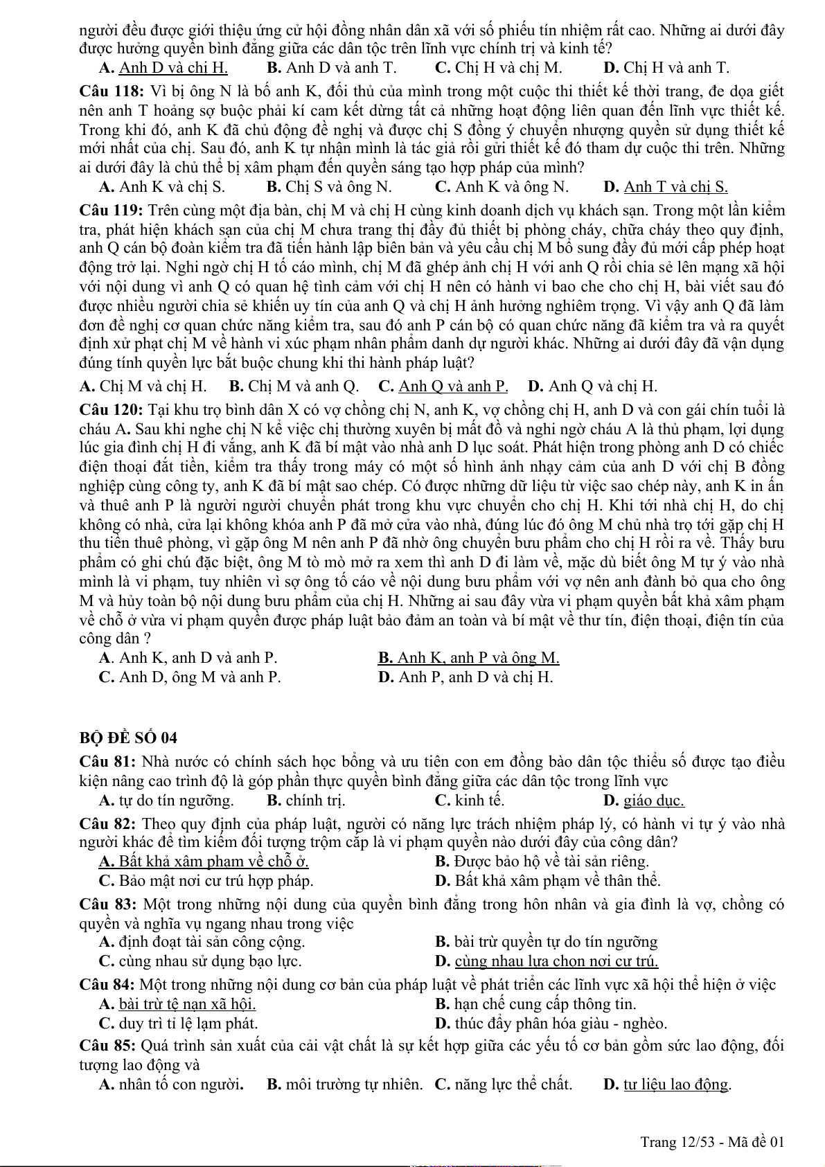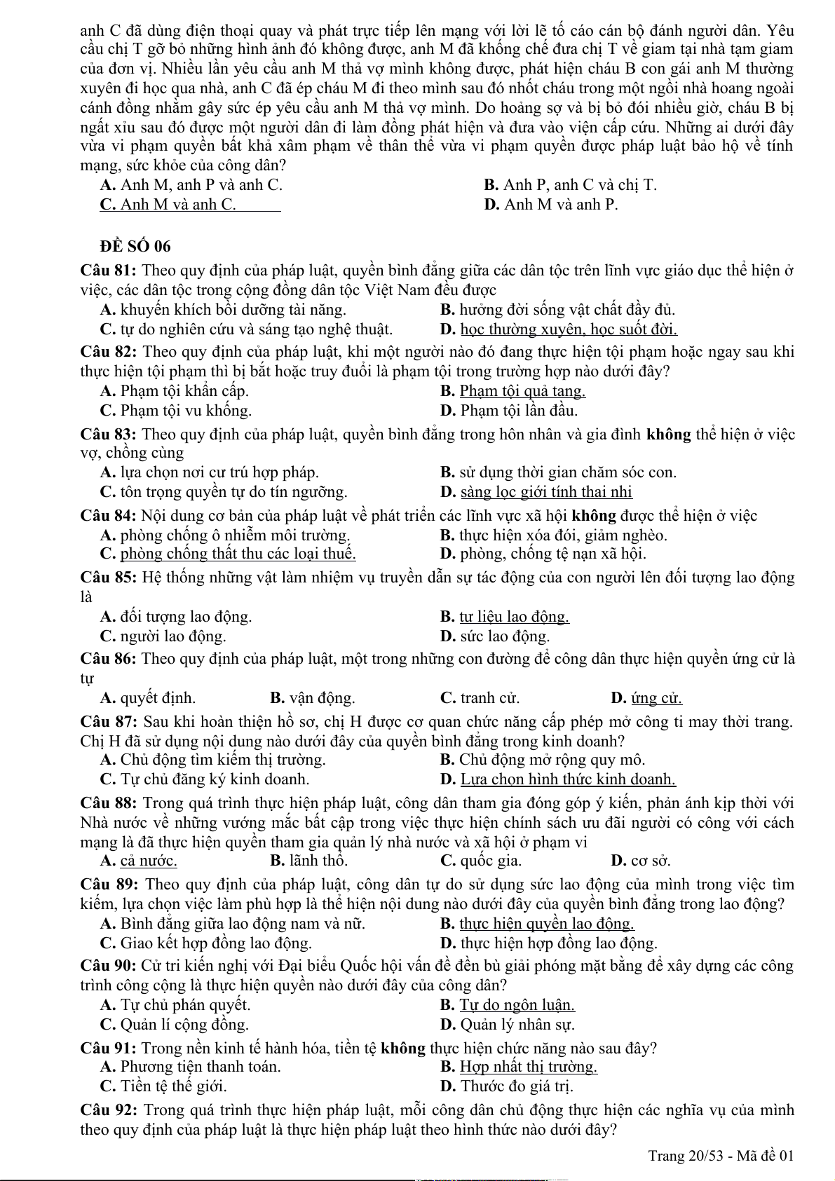 Câu 94: Theo quy định của pháp luật, quyền khiếu nại, tố cáo là công cụ để nhân dân thực hiện hình thức dân chủ A. chỉ định. B. tập trung. C. gián tiếp. D. trực tiếp. Trang 1/53 - Mã đề 01