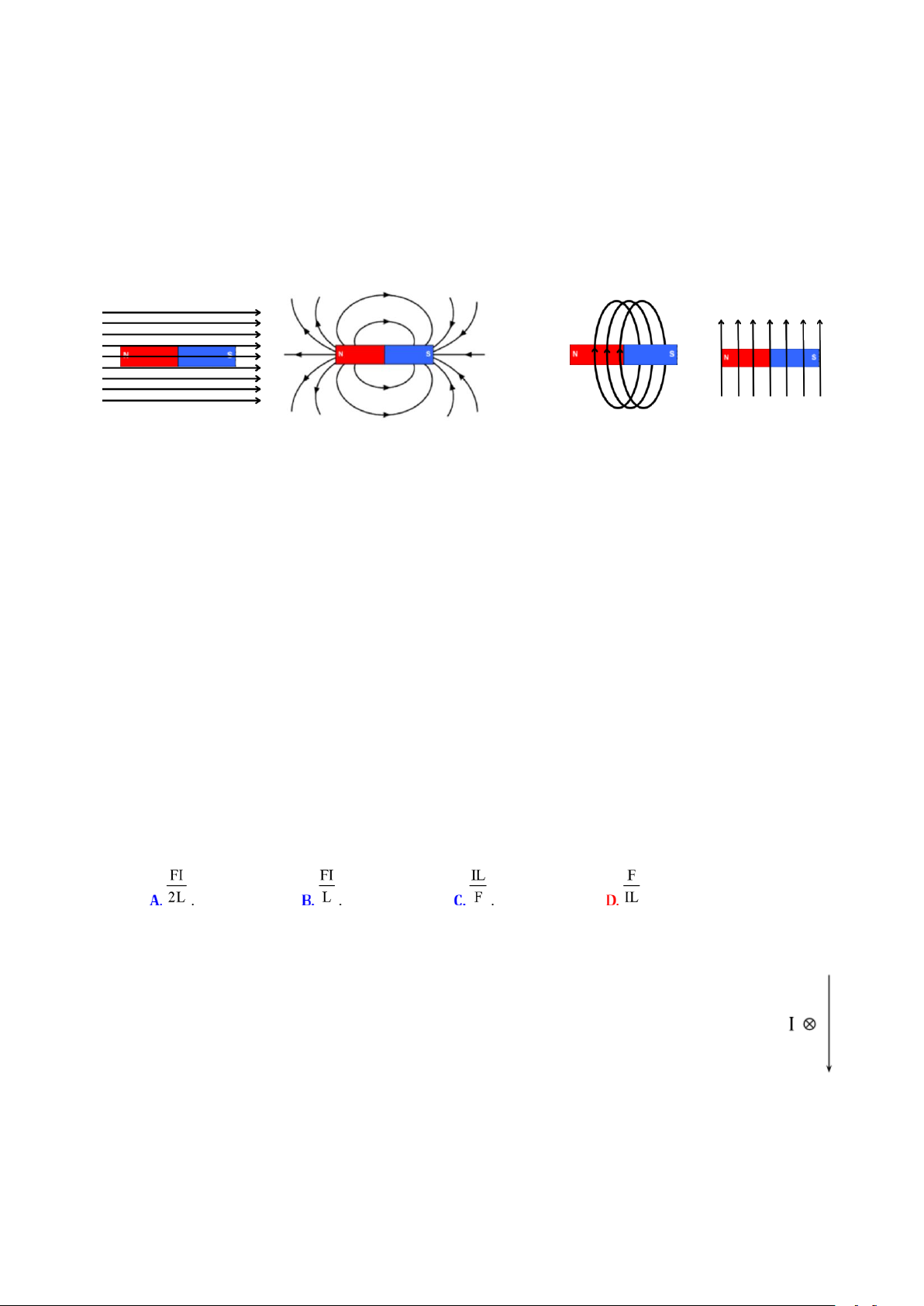Câu 9. Biểu thức tính lực từ tác dụng lên đoạn dòng điện là A. BI𝑙 I𝑙 B F = B. F = C. F = BI𝑙. sinθ D. F = sinθ B.sinθ I𝑙sinθ
