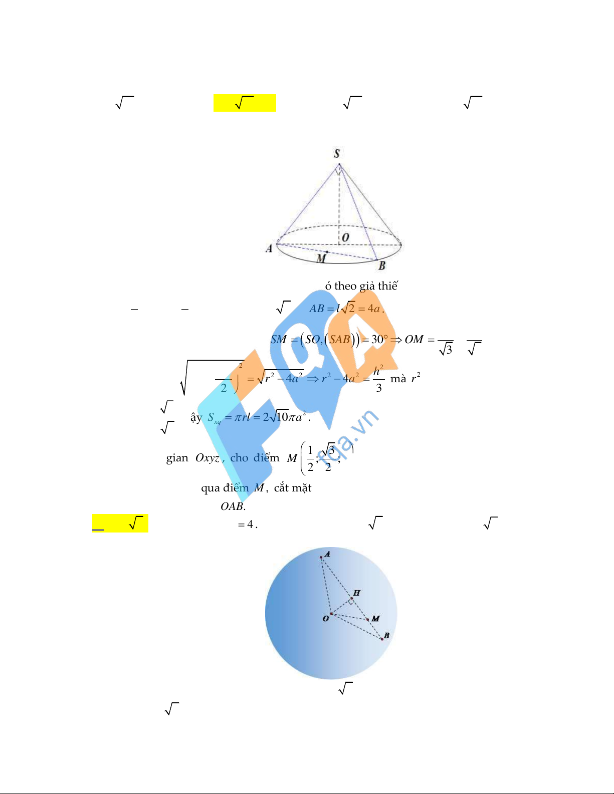 trục SO và mặt phẳng SAB bằng 30 . Diện tích xung quanh của hình nón đã cho bằng A. 2 4 10 a . B. 2 2 10 a . C. 2 10 a . D. 2 8 10 a . Lời giải: