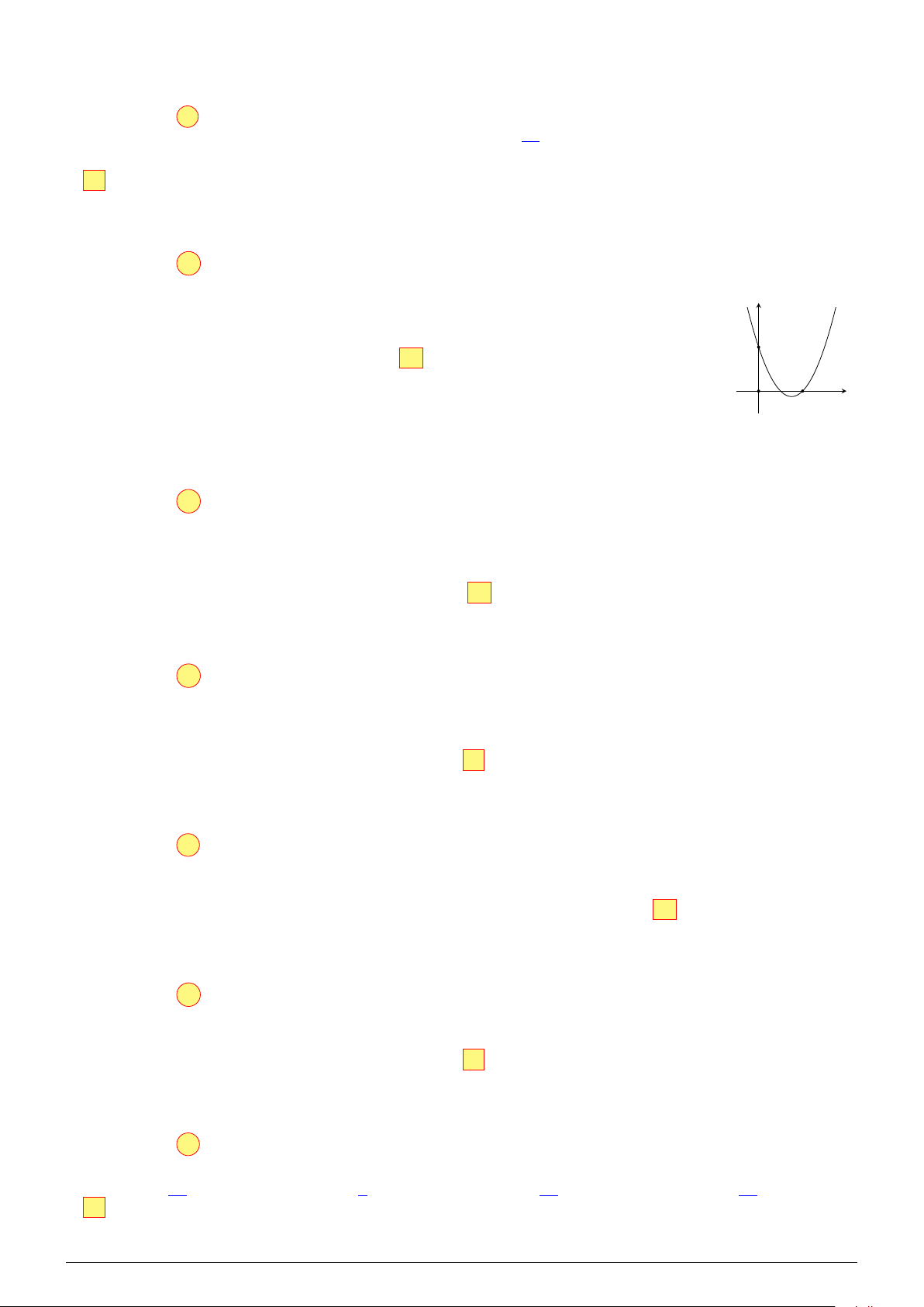 Câu 1. Cho hàm số f (x) = ax2 + bx + c có đồ thị như hình vẽ. y a) f (1) = 1. b a > 0. 1 c) a + b + c > 1. d a − b = 10. 2 3 x O 1 3 2 −1 Lời giải. 1