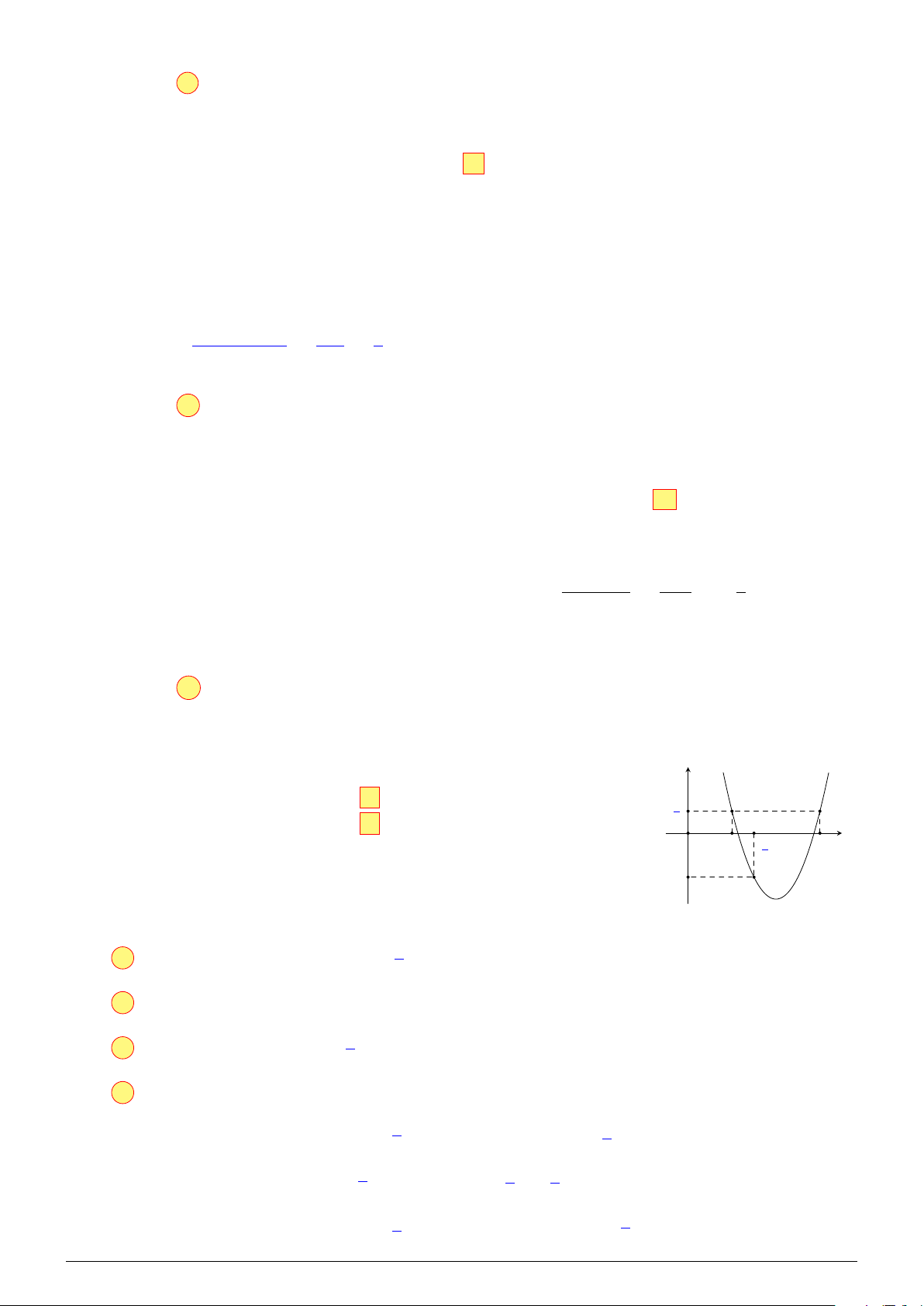 Từ đề bài, ta có A(−1; 2) ∈ (P); B(5; 2) ∈ (P) và (P) có tung độ đỉnh bằng −2. Do đó a − b + c = 2 b = −4a 25a + 5b + c = 2 ⇔ c = −5a + 2 ∆ − = −2 b2 − 4ac = 8a 4a b = −4a ⇔ c = −5a + 2 16a2 − 4a(−5a + 2) = 8a b = −4a ⇔ c = −5a + 2 4 a = (do a ̸= 0) 9 16 b = − 9 2 ⇔ c = − 9 4 a = . 9 4 16 2
