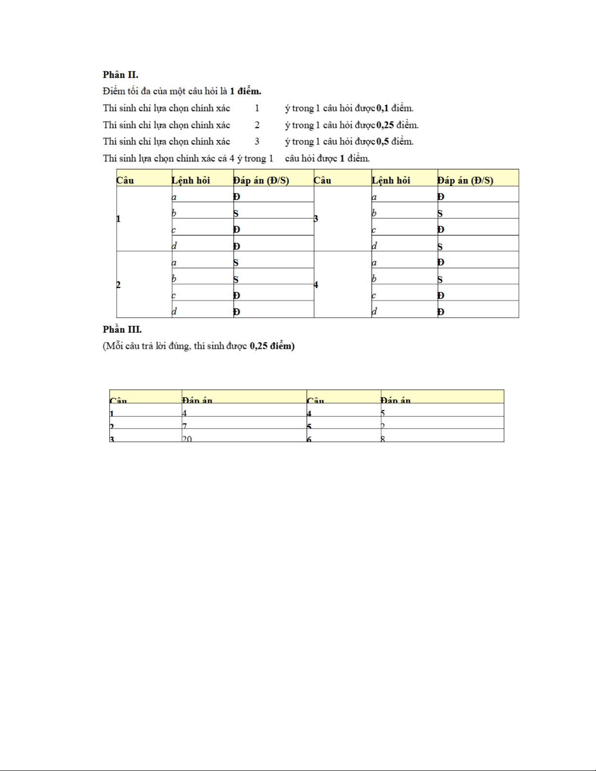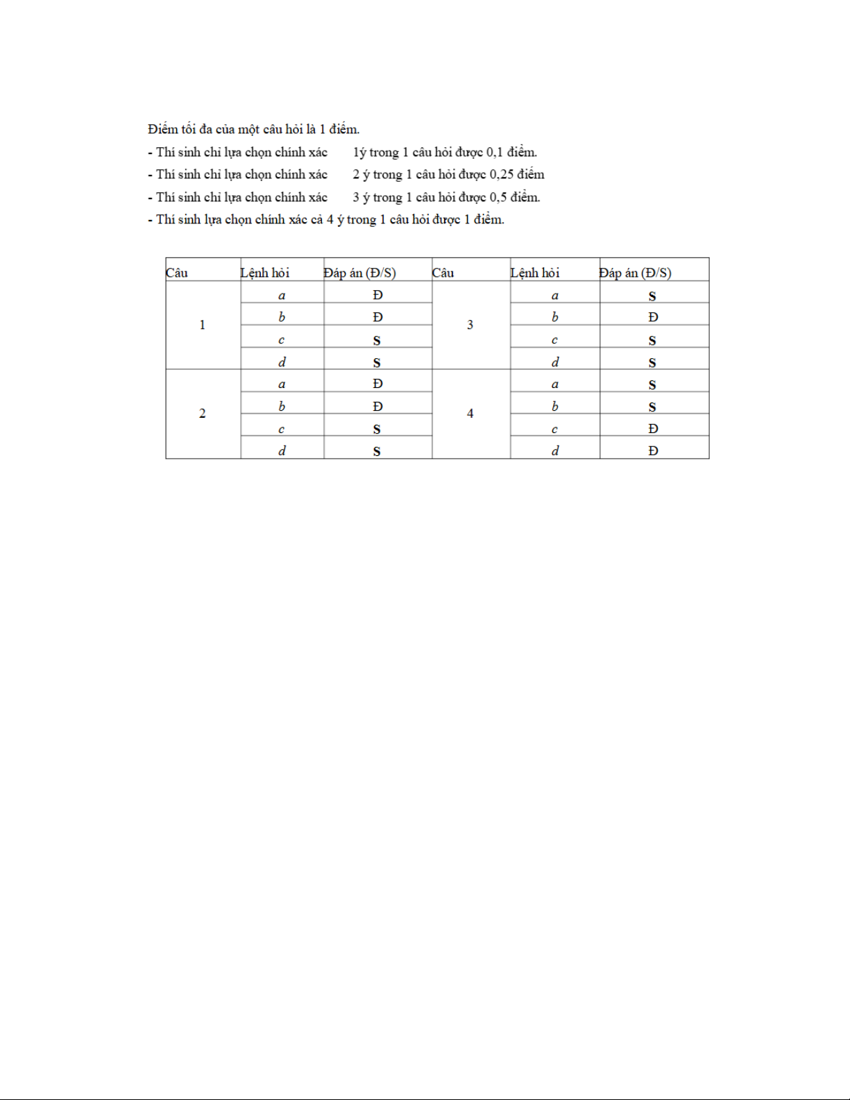 d) ở mỗi câu, thí sinh chọn đúng hoặc sai.