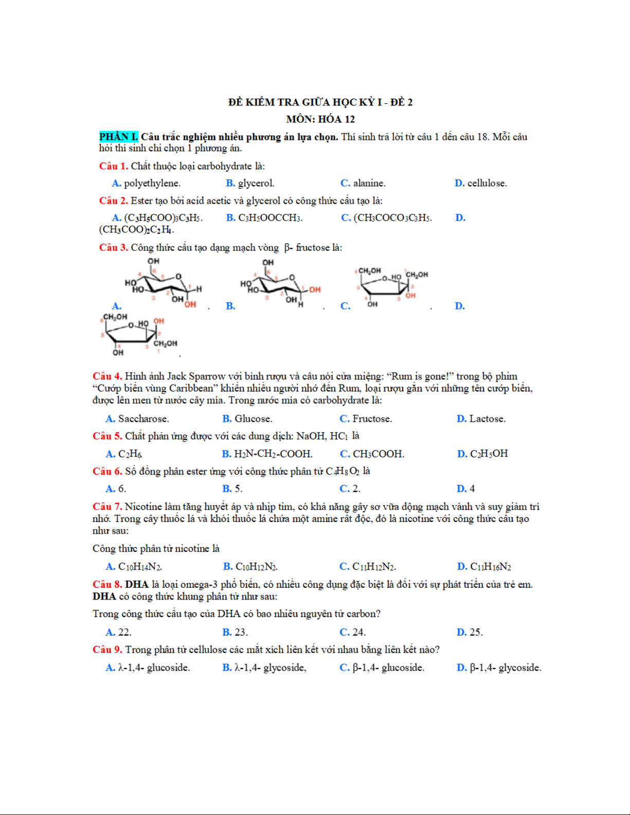 ĐỀ KIỂM TRA GIỮA HỌC KỲ I - ĐỀ 1 MÔN: HÓA 12