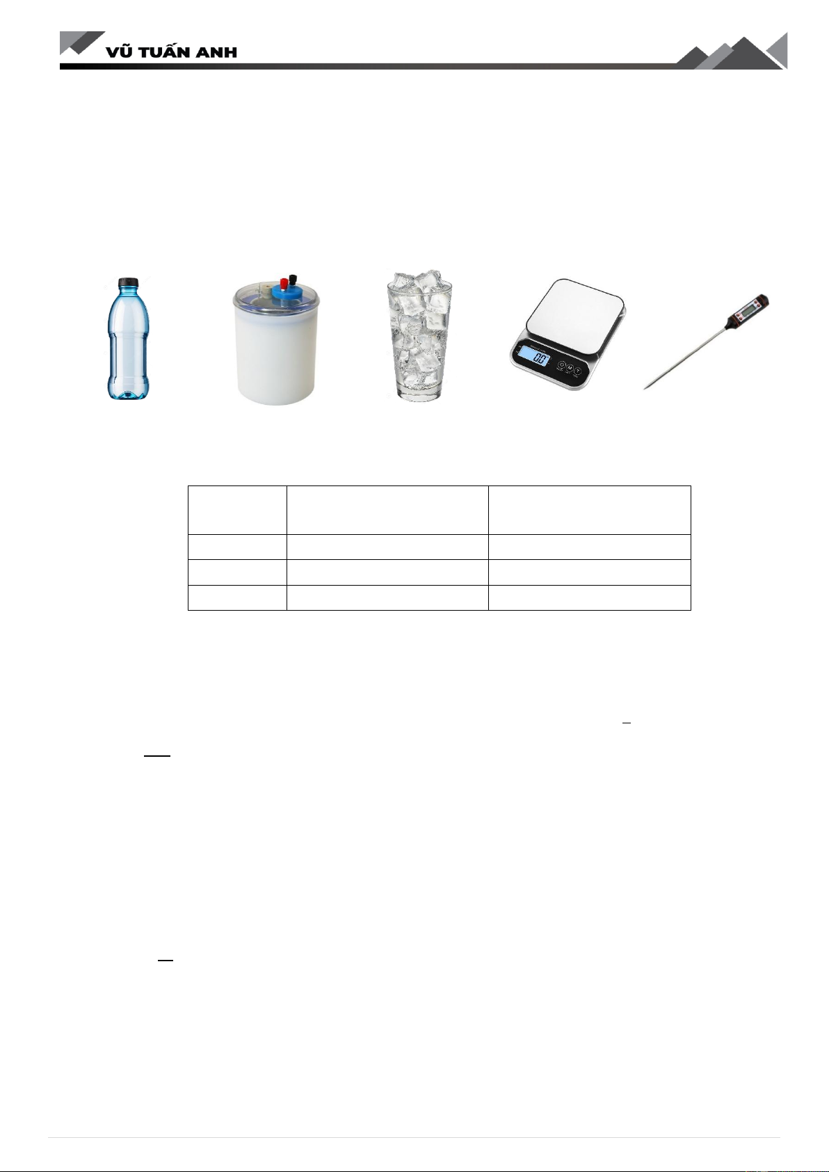 Câu 1: Một nhóm học sinh thực hiện thí nghiệm đo nhiệt nóng chảy riêng của nước đá bằng dụng cụ thực