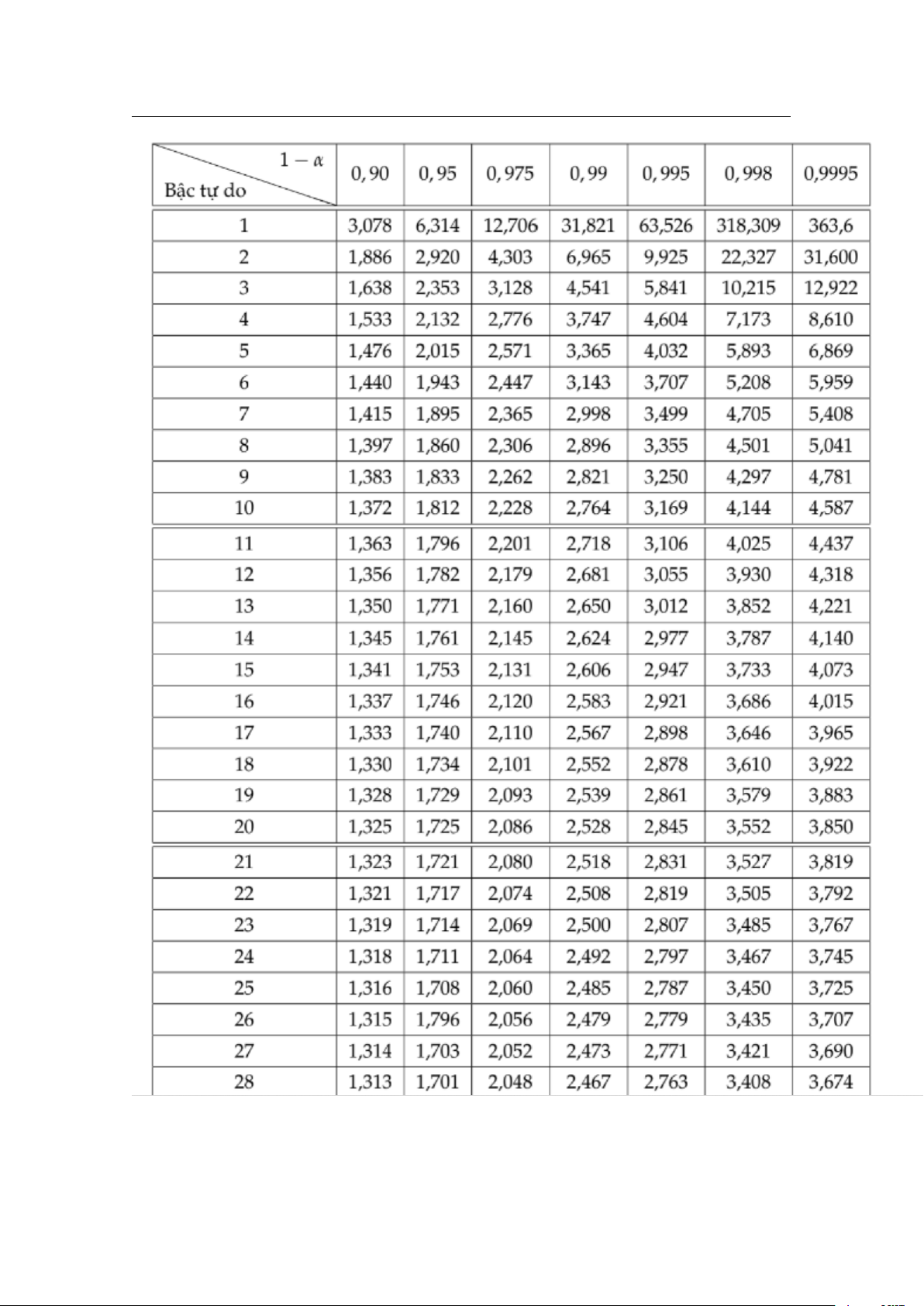 Giá trị tn1− của phân phối Student α