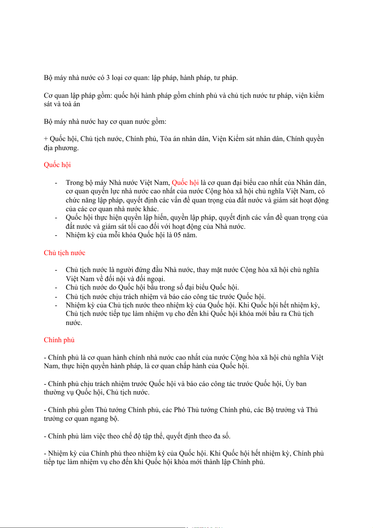 + Quốc hội, Chủ tịch nước, Chính phủ, Tòa án nhân dân, Viện Ki(m sát nhân dân, Chính quyền địa phương. Quốc hô &i -