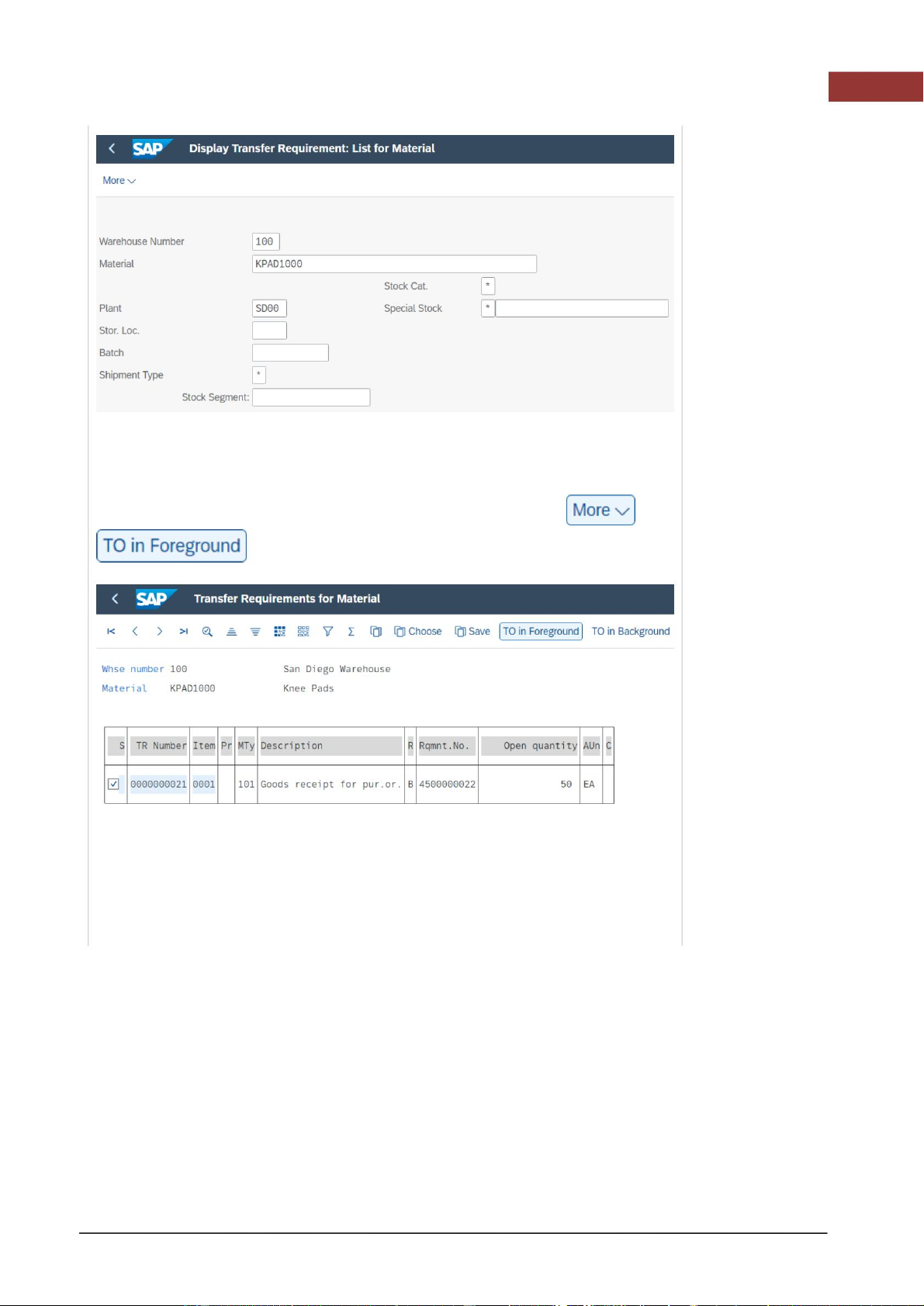 Trong màn hình Hiển thị Yêu cầu Chuyển giao: Danh sách Vật liệu, nhập 100 100