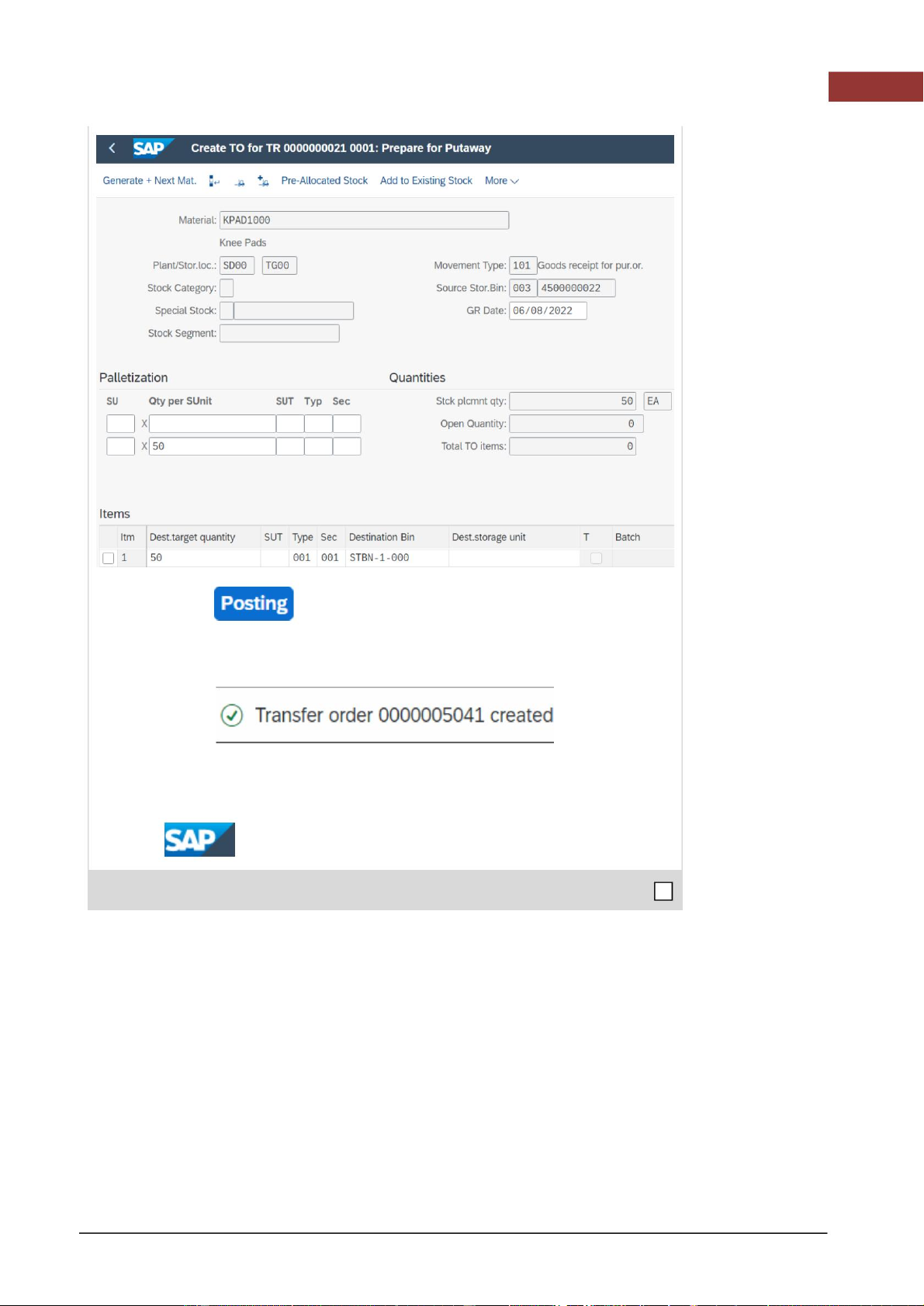 Trong phần này, nhập 001 vào ô Sec, STBN-1-### vào ô Destination Bin (thay thế ### bằng 001 STBN-1-###