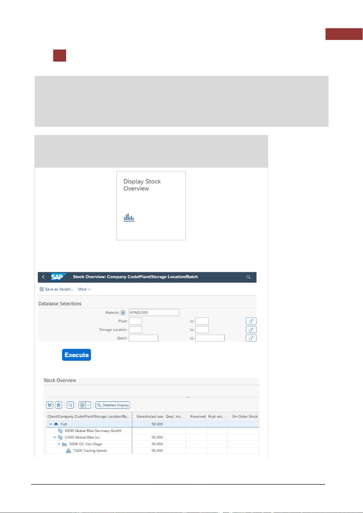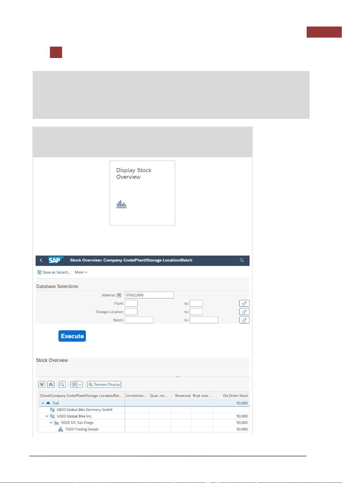 Trong màn hình Hiển thị tồn kho vật liệu trong kho , nhập KPAD1### làm Vật liệu. Đảm bảo tất cả KPAD1###