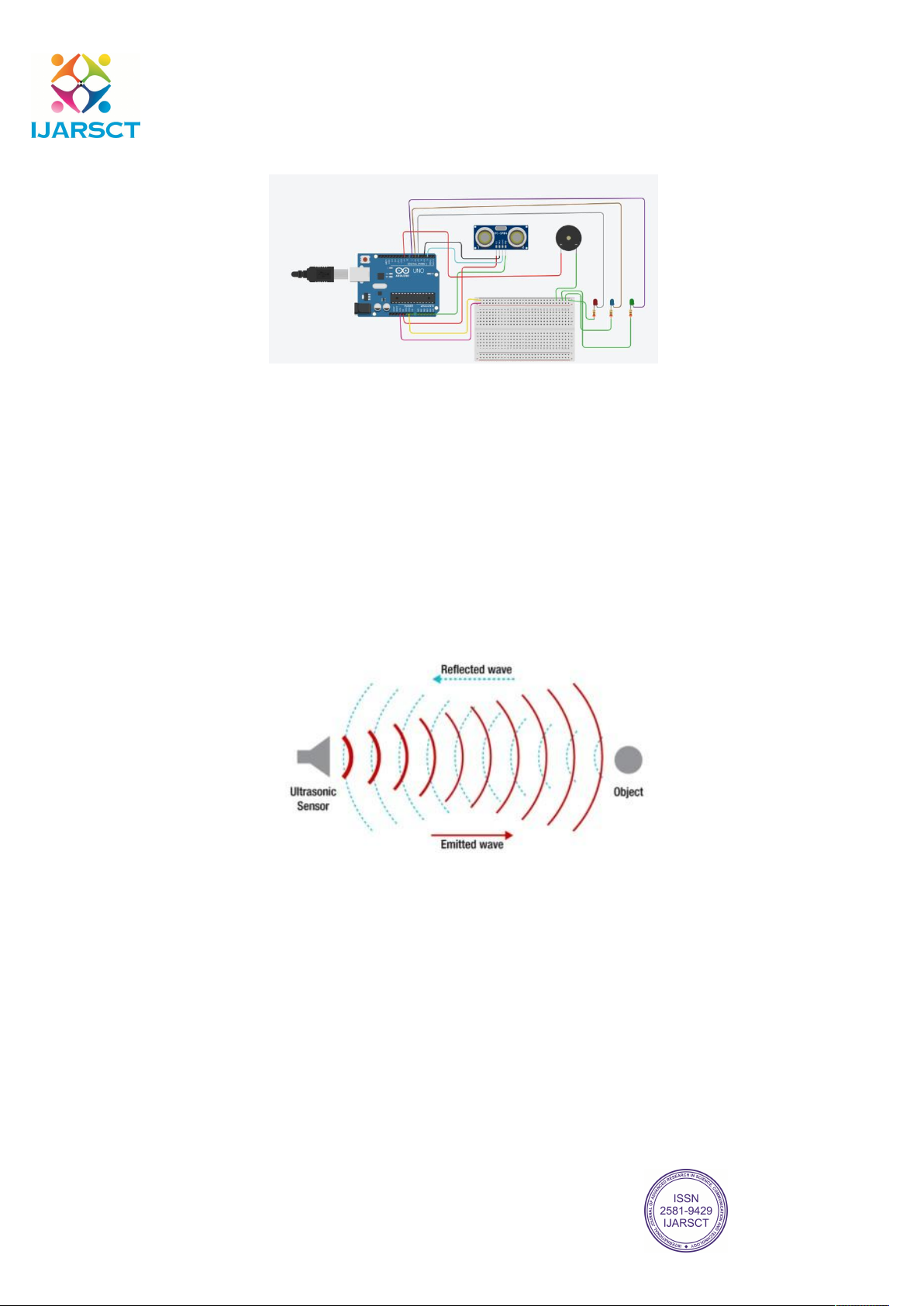 The developed model mainly consists of the following parts: HC-SR04 Ultrasonic Sensors Arduino UNO Buzzer 6x2 LCD LED (Red, Blue, Green) Copyright to IJARSCT DOI: 10.48175/568 41 www.ijarsct.co.in IJARSCT ISSN (Online) 2581-9429