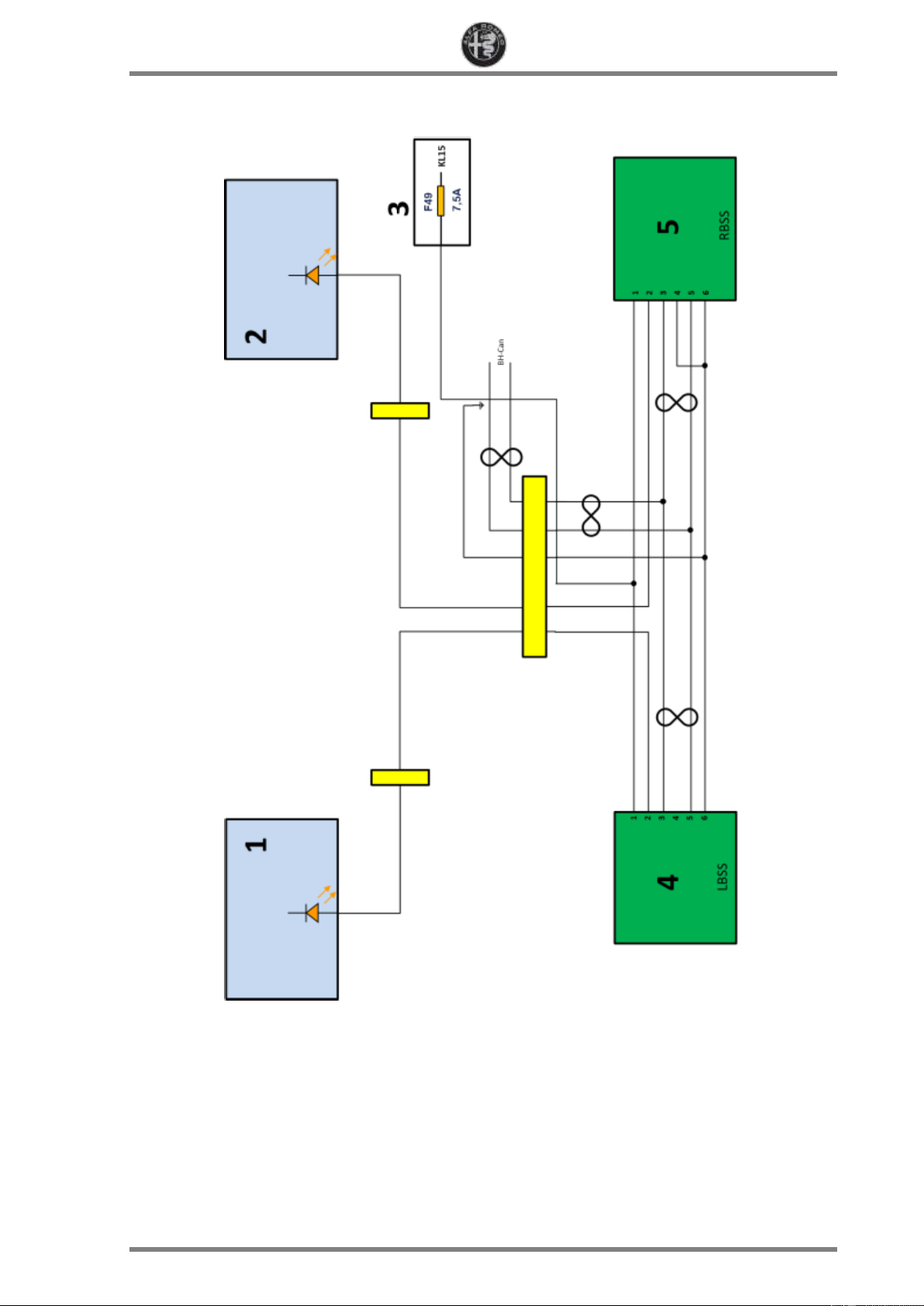 All rights reserved. The circulation and reproduction of all or part of this document by any means is prohibited. ALFA ROMEO STELVIO -4- REV 0.0 Wiring diagram Key 1. BSM icon on RH wing mirror 2. BSM icon on LH wing mirror 3. BCM 4. LH radar sensor 5. RH radar sensor