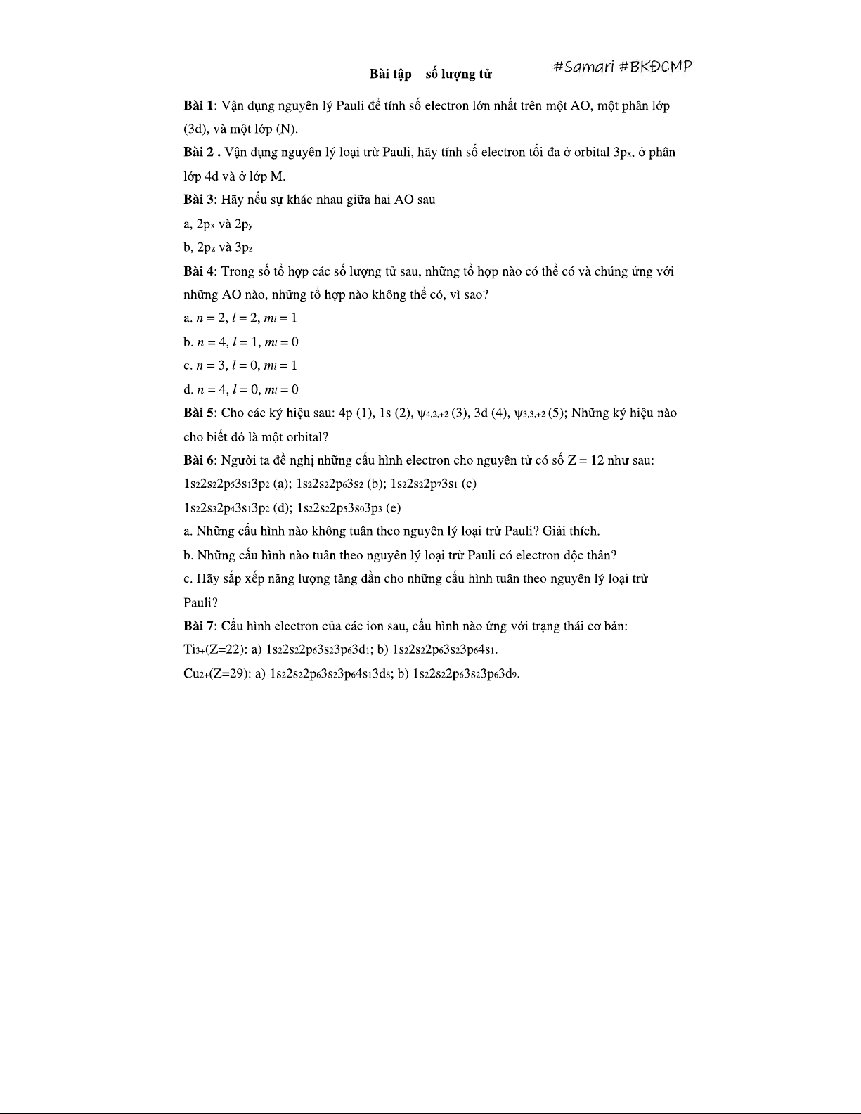 BT - Số lượng tử: Bài Tập Về Nguyên Lý Pauli và Cấu Hình Electron