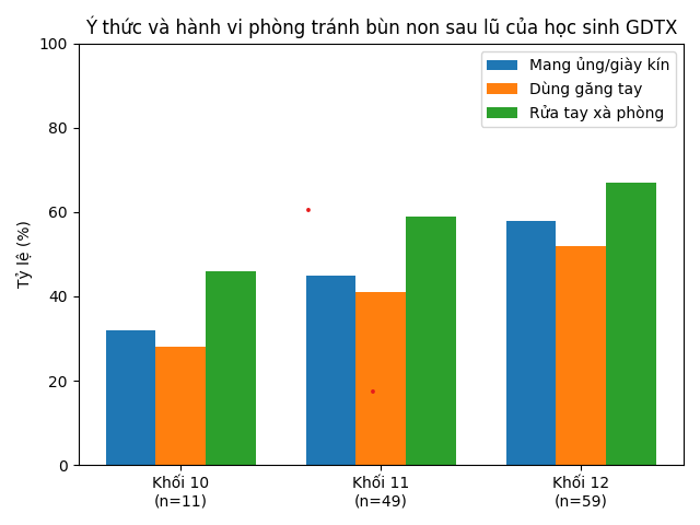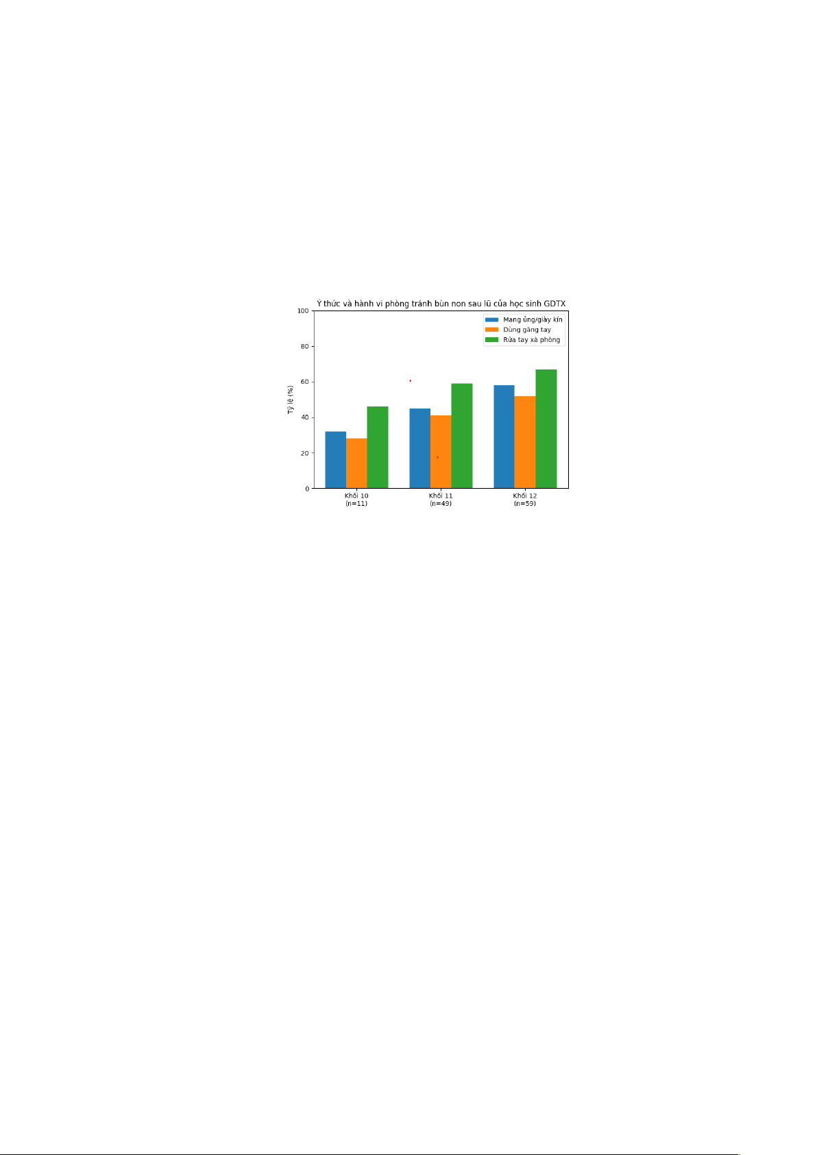 Đối với hành vi rửa tay bằng xà phòng sau khi tiếp xúc với bùn non, kết quả khảo sát cho thấy đây là hành vi được thực hiện phổ biến hơn so với các biện pháp khác. Tỷ lệ học sinh thực hiện hành vi này ở khối 10 là 46% (khoảng 5/11 học sinh), khối 11 là 59% (khoảng 29/49 học sinh) và khối 12 là 67% (khoảng 40/59 học sinh). Điều này cho thấy học sinh đã có ý thức nhất định về vệ sinh cá nhân sau lũ, tuy nhiên vẫn còn một bộ phận học sinh chưa thực hiện đầy đủ các biện pháp phòng tránh cần thiết.
