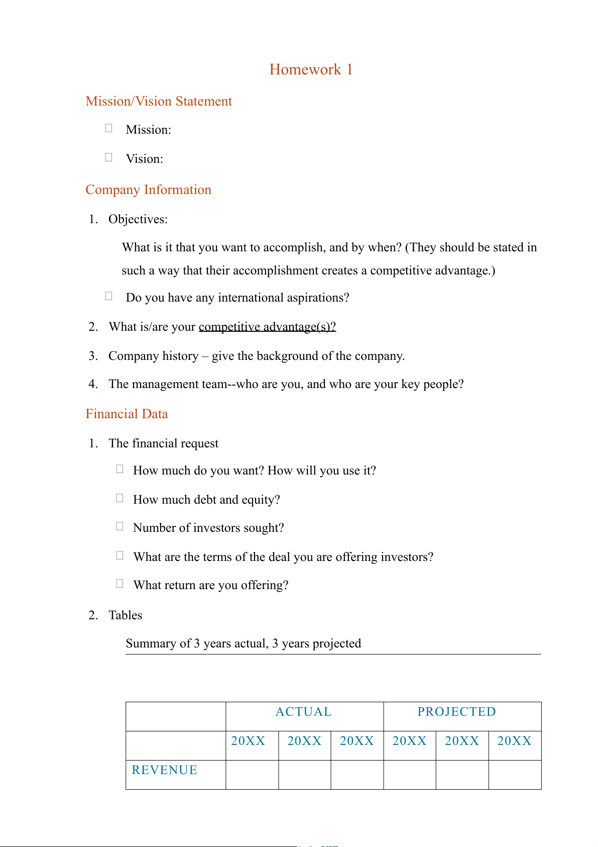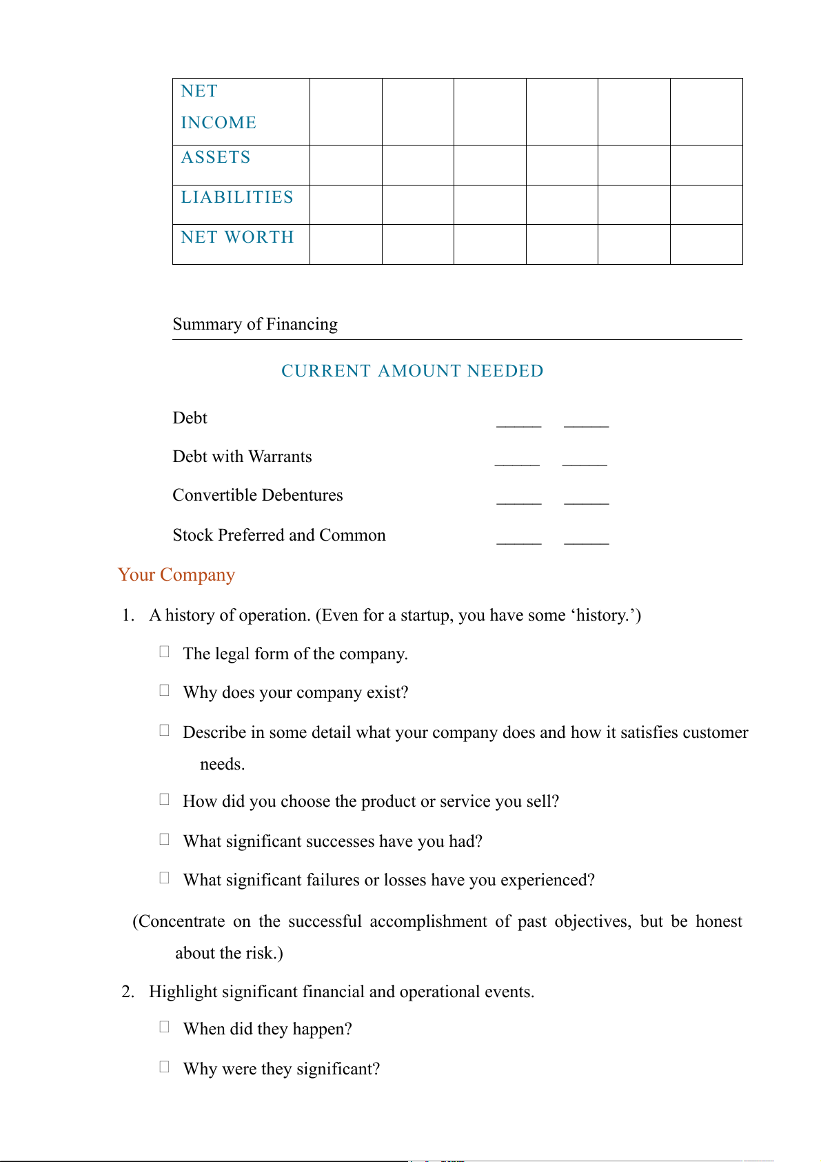 Summary of 3 years actual, 3 years projected ACTUAL PROJECTED 20XX 20XX 20XX 20XX 20XX 20XX REVENUE NET INCOME ASSETS LIABILITIES NET WORTH Summary of Financing CURRENT AMOUNT NEEDED Debt _____ _____ Debt with Warrants _____ _____ Convertible Debentures _____ _____ Stock Preferred and Common _____ _____ Your Company