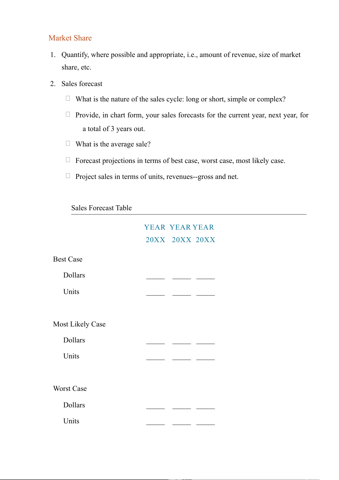 Project sales in terms of units, revenues--gross and net. Sales Forecast Table YEAR YEAR YEAR 20XX 20XX 20XX Best Case Dollars _____ _____ _____ Units _____ _____ _____ Most Likely Case Dollars _____ _____ _____ Units _____ _____ _____ Worst Case Dollars _____ _____ _____ Units _____ _____ _____