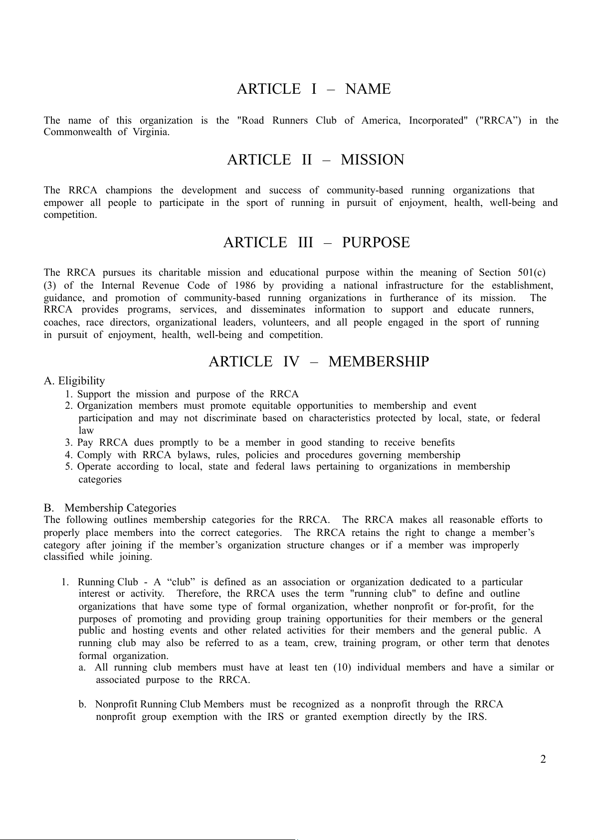 The name of this organization is the "Road Runners Club of America, Incorporated" ("RRCA”) in the Commonwealth of Virginia.