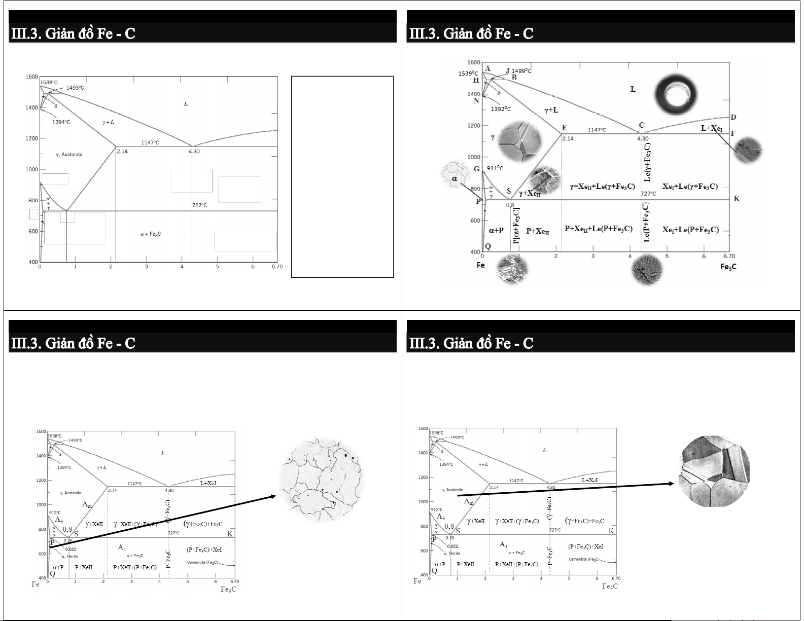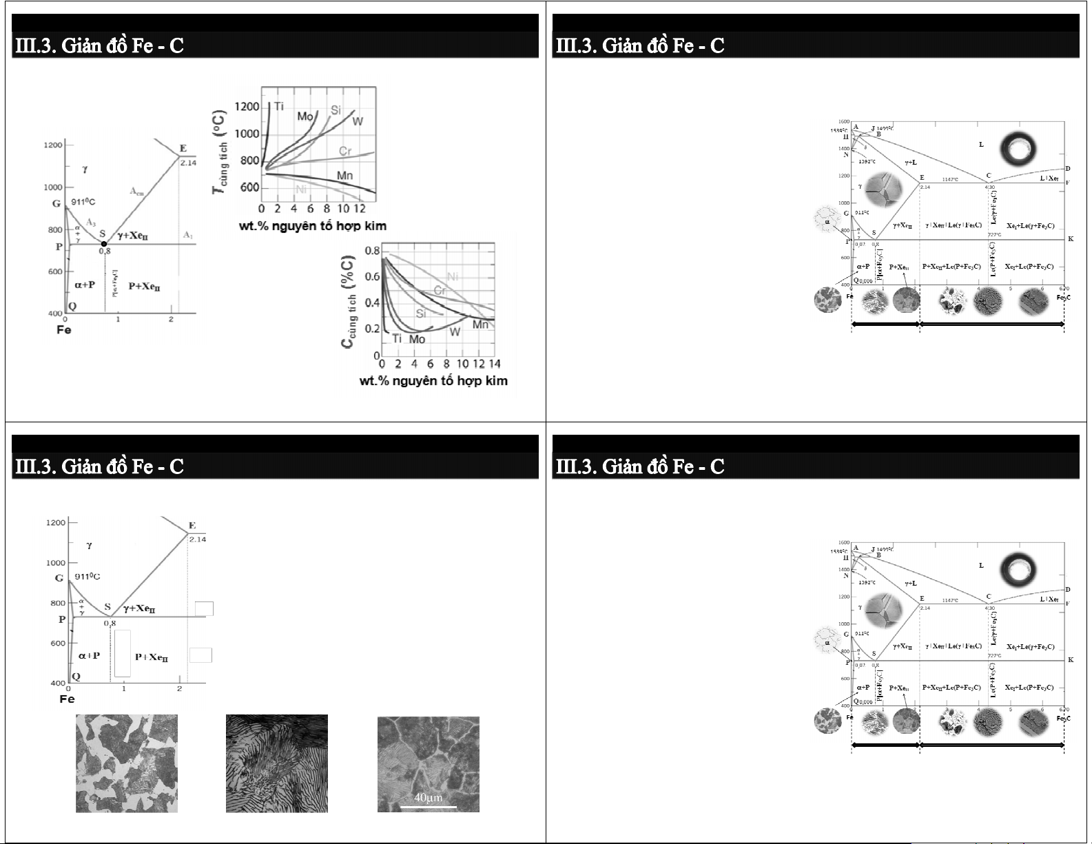 Thành phần, nhiệt độ, tổ chức tế vi các pha: Ferrit, Austenit, Xe, P, Le