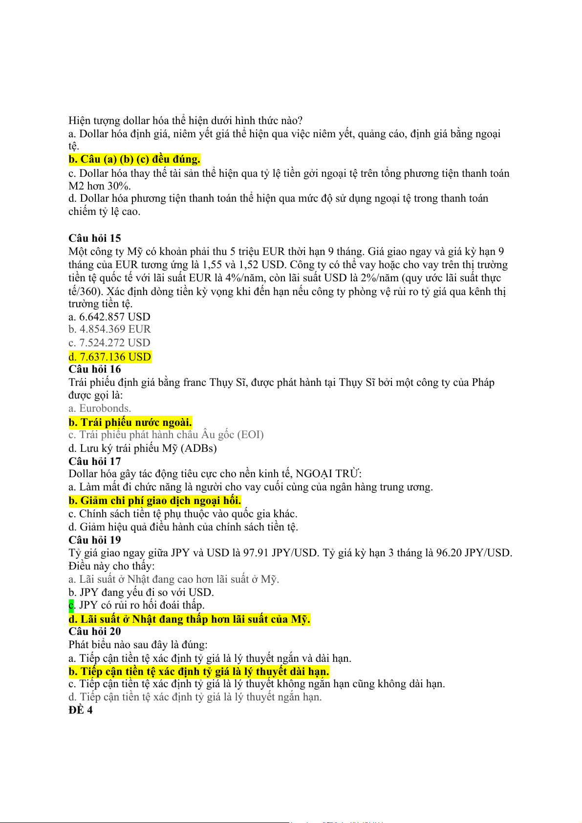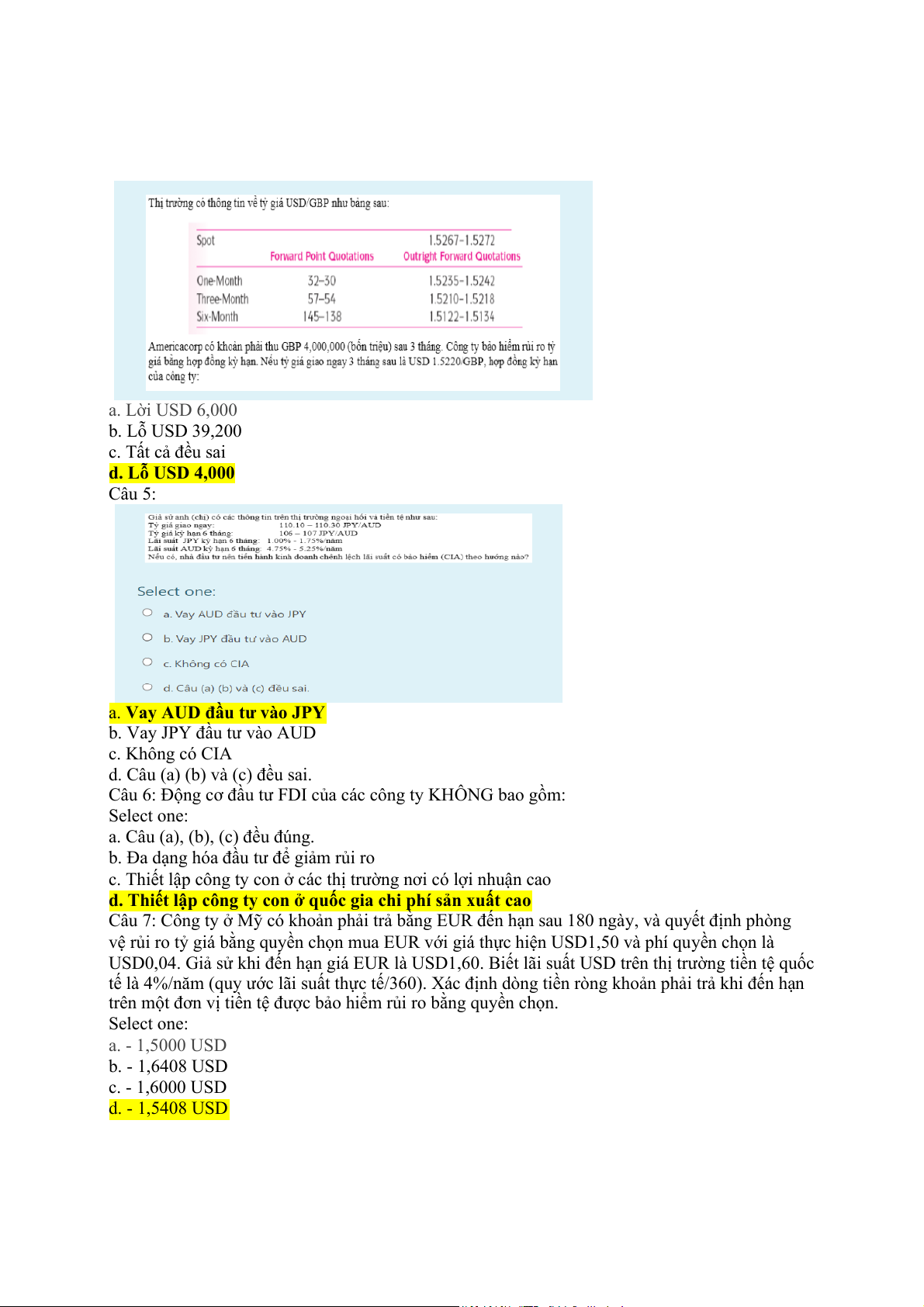 d. Rủi ro chính trị Câu 2: a. Lời USD 6,000 b. Lỗ USD 39,200 c. Tất cả đều sai d. Lỗ USD 4,000 Câu 5: