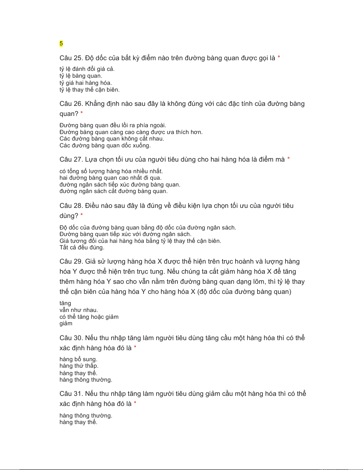 Câu 22. Đường bàng quan đối với hai sản phẩm thay thế hoàn hảo là * đường thẳng. đường cong lõm. đường giống chữ L.