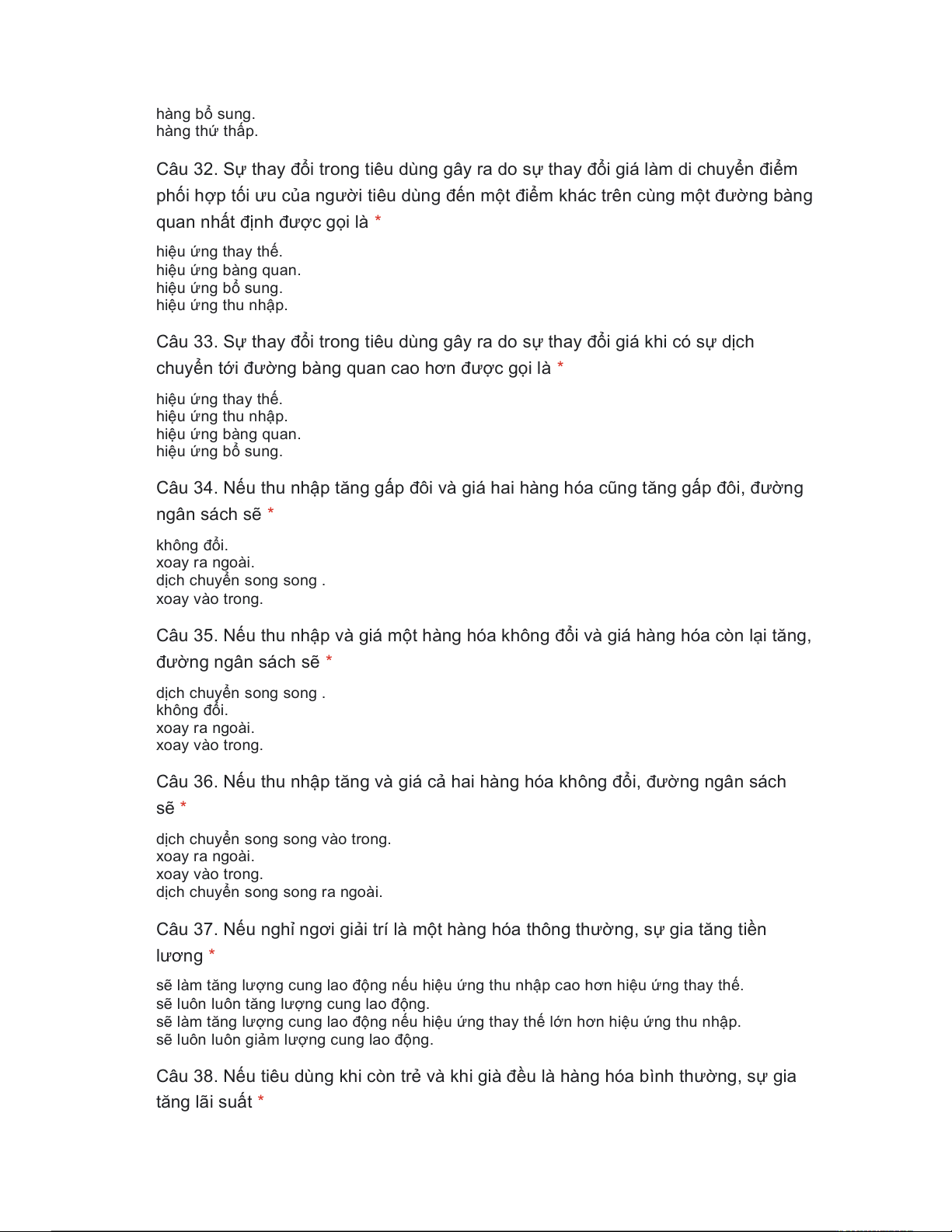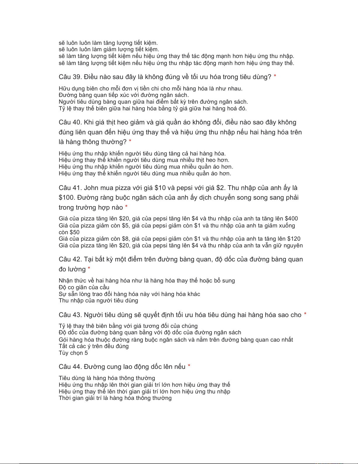 Câu 34. Nếu thu nhập tăng gấp đôi và giá hai hàng hóa cũng tăng gấp đôi, đường ngân sách sẽ * không đổi. xoay ra ngoài. dịch chuyển song song . xoay vào trong.