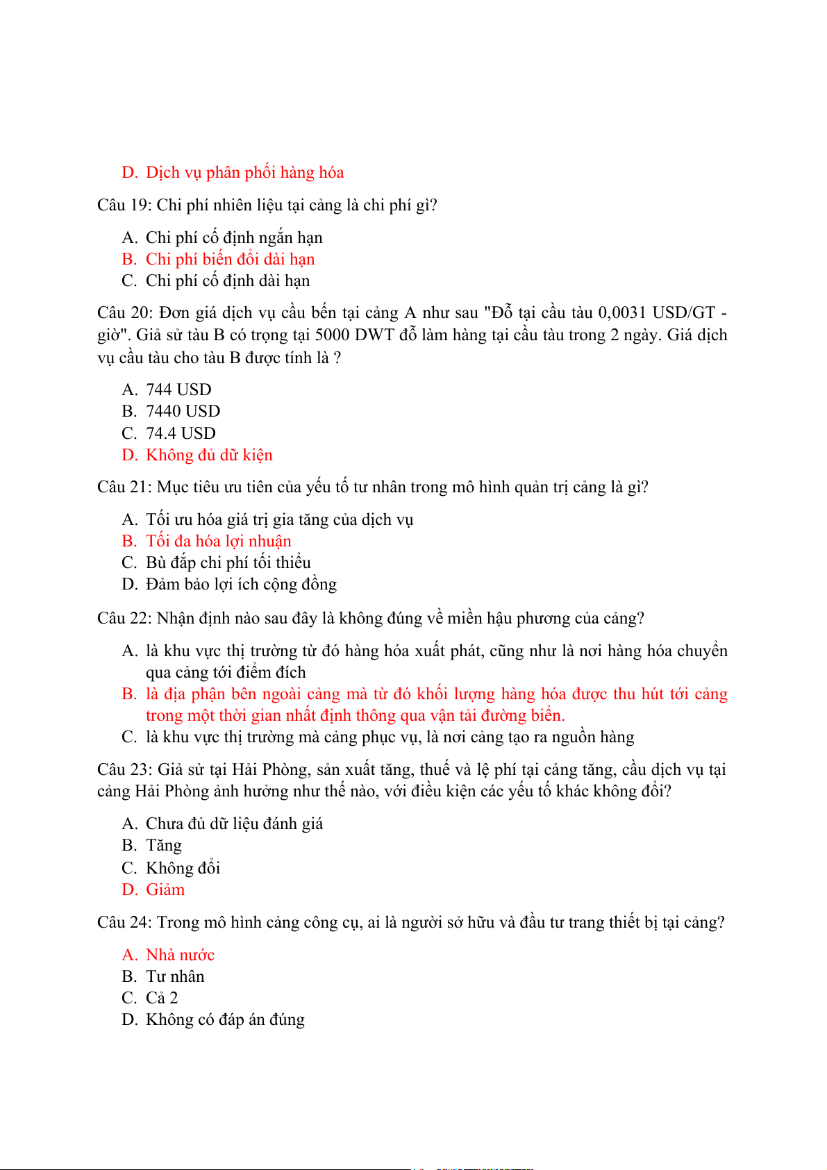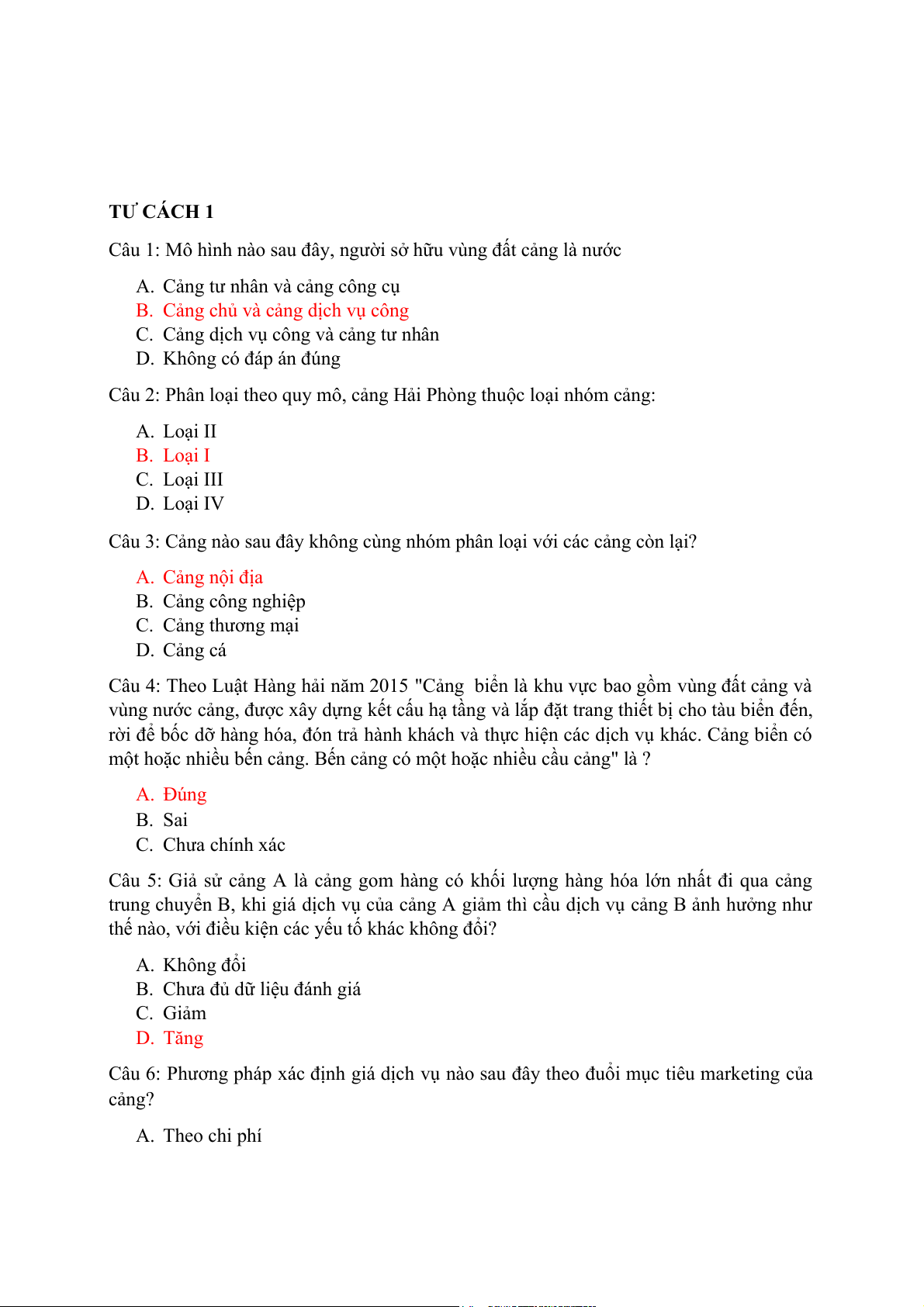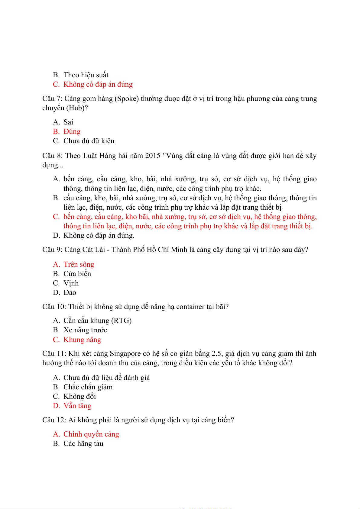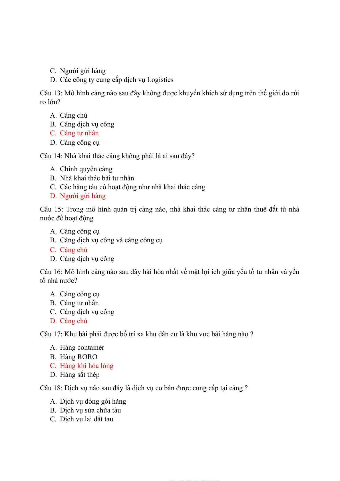 Câu 16: Mô hình cảng nào sau đây hài hòa nhất về mặt lợi ích giữa yếu tố tư nhân và yếu tố nhà nước? A. Cảng công cụ B. Cảng tư nhân C. Cảng dịch vụ công D. Cảng chủ