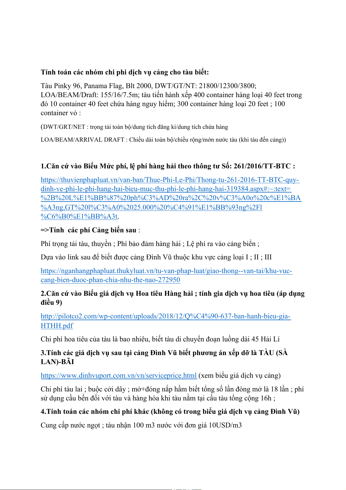 3.Tính các giá dịch vụ sau tại cảng Đình Vũ biết phương án xếp dỡ là TÀU (SÀ LAN)-BÃI
