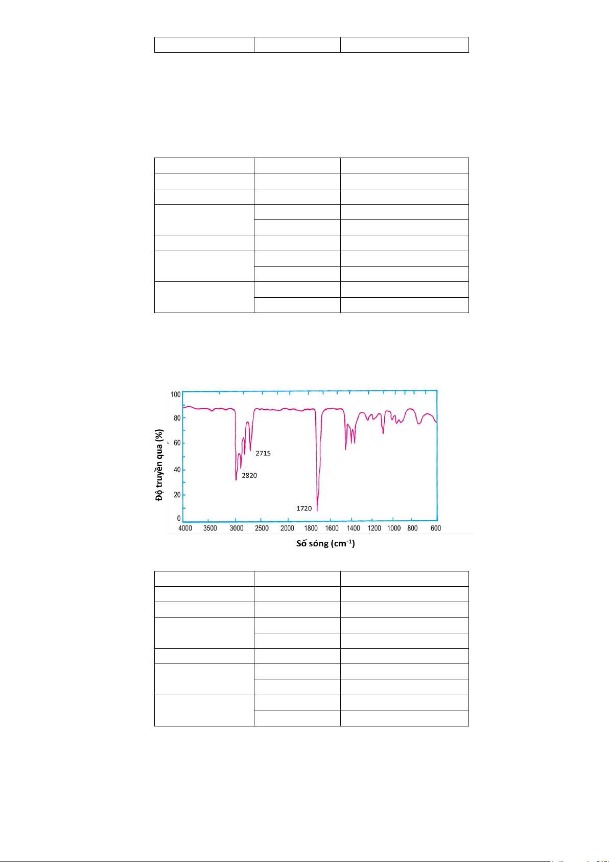 Bảng tín hiệu phổ hồng ngoại của một số nhóm chức cơ bản Hợp chất Liên kết Số sóng (cm-1) Alcohol O – H 3500 – 3200 Amine N – H 3300 – 3000 C – H Aldehyde 2830 – 2695 C = O 1740 – 1685 Ketone C = O 1715 – 1666 C = O Carboxylic acid 1760 – 1690 O – H 3300 – 2500 C = O 1750 – 1715 Ester C – O 1300 – 1000