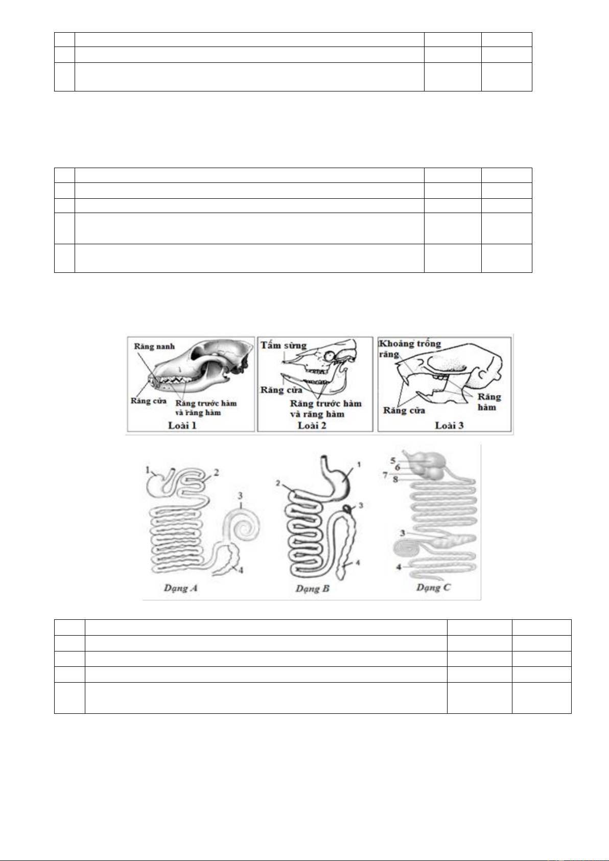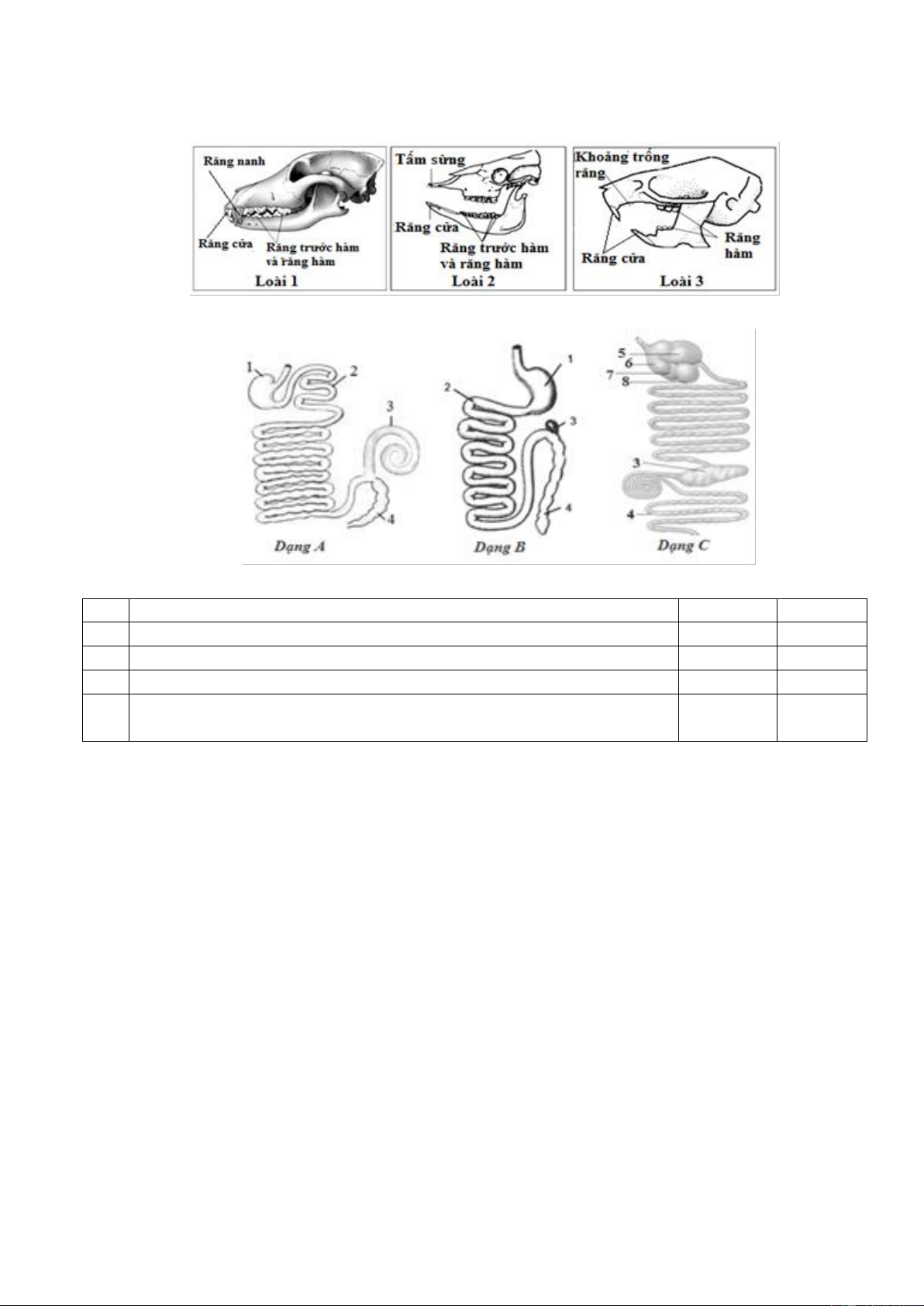 Câu 1. Cho thông tin ở bảng sau: Hình thức Đặc điểm 1. Có ống tiêu hóa a. Con người 2. Có túi tiêu hóa b. Bò c. Ruột khoang d. Cá e. Trùng roi