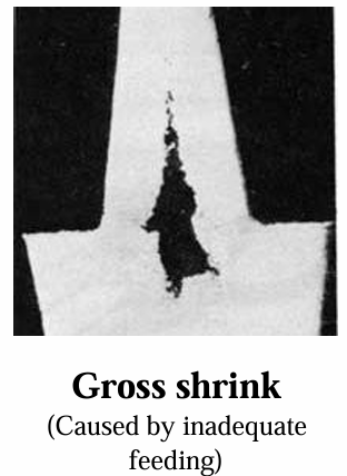 | Do bù trừ co ngót không đủ (inadequate feeding). Vùng cuối cùng đông đặc (thường ở riser hoặc vị trí nóng) co ngót mạnh, tạo lỗ lớn bên trong hoặc lộ ra. Thường xảy ra ở hợp kim có khoảng kết tinh rộng. | Thiết kế riser (lõi bù) phù hợp, hướng đông đặc tiến triển (directional solidification), tăng áp lực rót. |