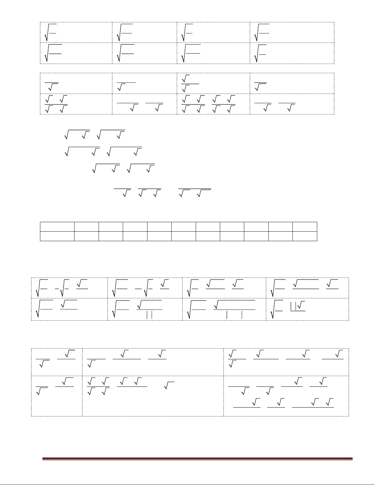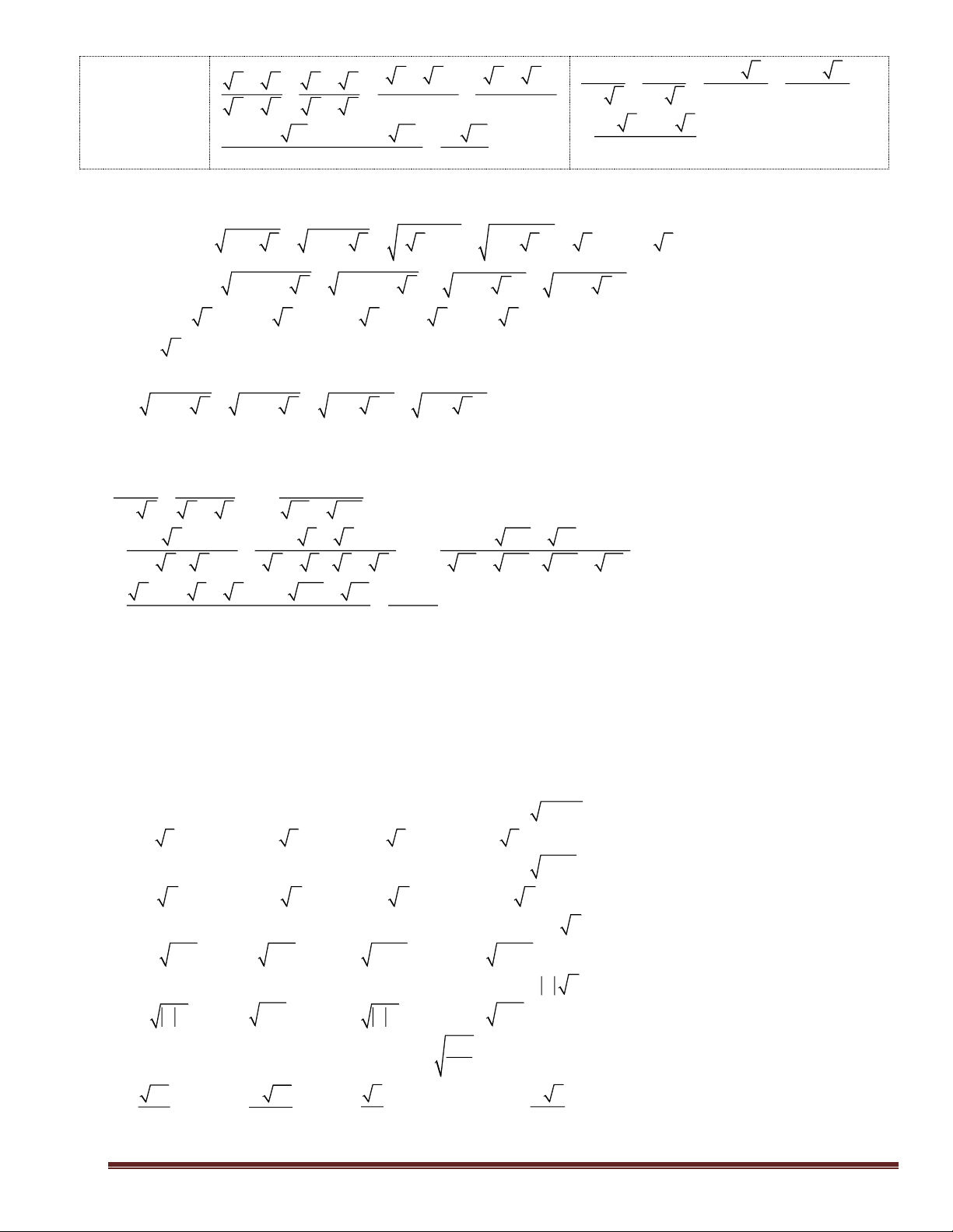 Bài 1: Khử mẫu các biểu thức lấy căn (giả thiết các biểu thức chứa chữ đều có nghĩa) 7 1 7 14 = = 1 1 1 2 = . = 5 5.9.2 10 = = 11 11.64.2. 22 = = 32 4 2 8 200 10 2 20 18 18 6 128 128 16 1 x −1 + + − − + 2 = 1 x x(1 x) x y x y x y = ( )( ) = x x 5 = x −1 x −1 x x x + y x + y 5 5