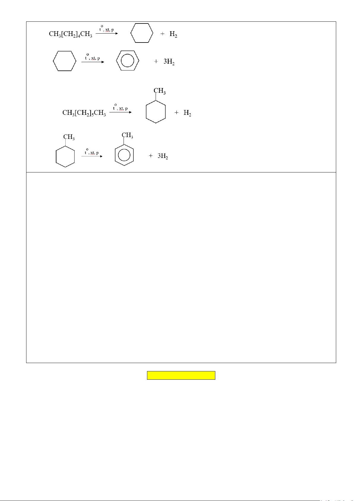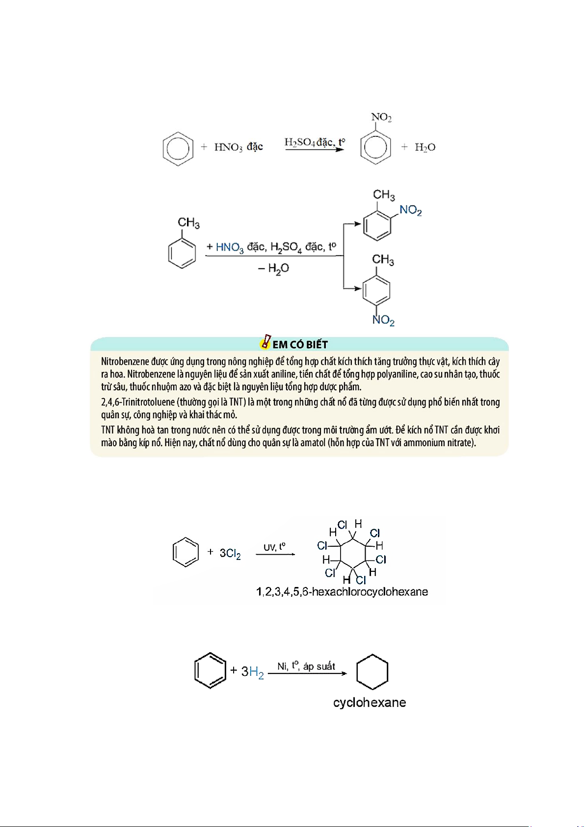 - Phản ứng cộng hydrogen vào benzene tạo thành cyclohexane. Phản ứng xảy ra ở điều kiện áp suất cao