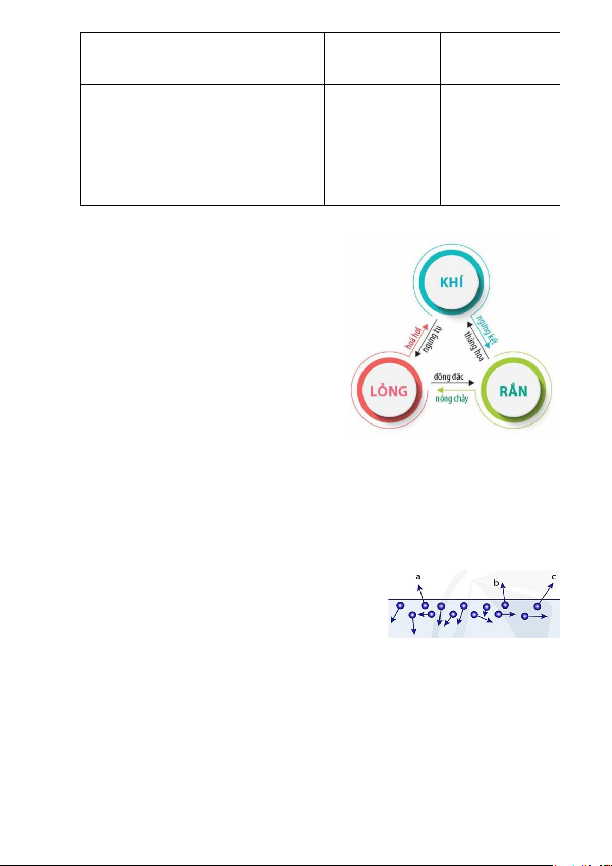 (Các phân tử được biểu diễn bằng các hình cầu) Cấu trúc Thể rắn Thể lỏng Thể khí Khoảng cách giữa Rất gần nhau (cỡ Xa nhau Rất xa nhau (gấp các phân tử kích thương phân tử) hàng chục lần kích Trang 1 thước phân tử) Sự sắp xếp của các Trật tự Kém trật tự hơn Không có trật tự phân tử Chuyển động của