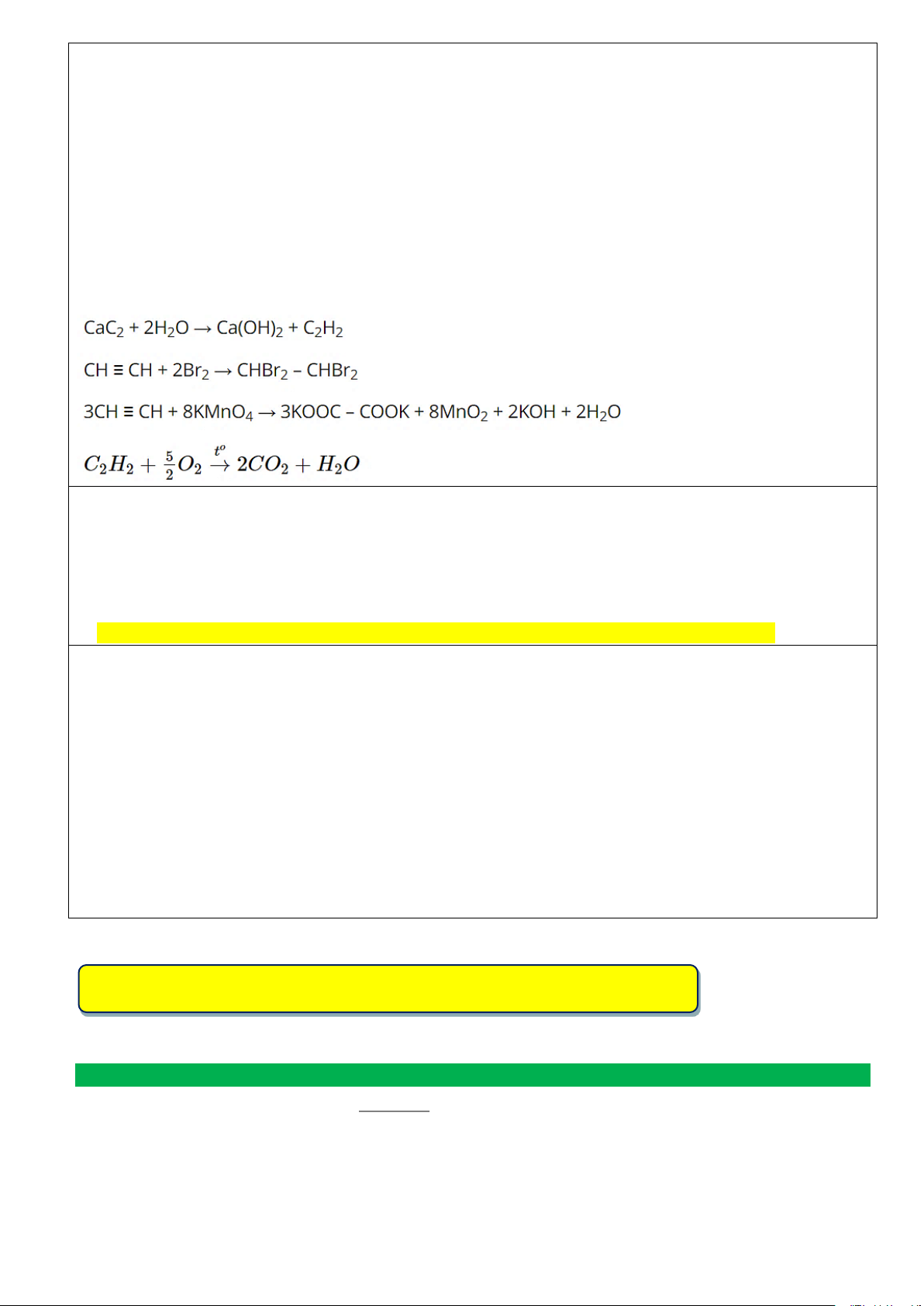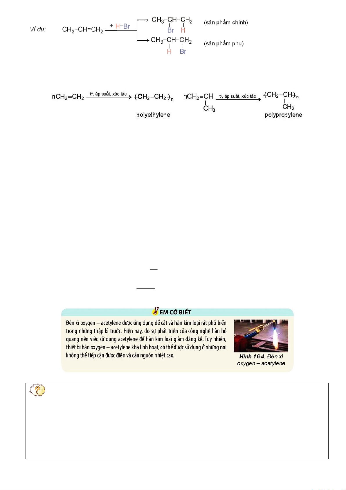 - Hydrogen hoá alkyne, tuỳ vào điều kiện áp suất, nhiệt độ và xúc tác, có thể nhận được sản phẩm là alkene, alkane. o Ví dụ: CHCH + H t , Pd/PbCO , p 2 3 ⎯⎯⎯⎯⎯⎯⎯ → CH2=CH2 CHCH + 2H2 o t , Ni, p ⎯⎯⎯⎯→ CH3–CH3