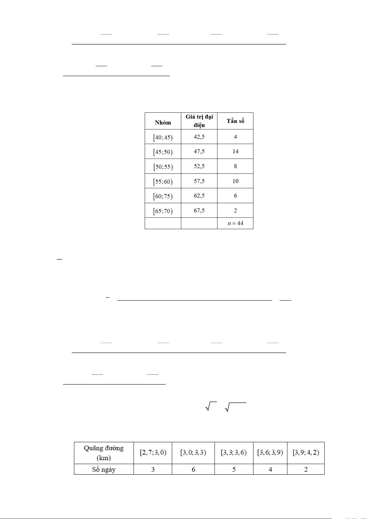Phương sai của mẫu số liệu ghép nhóm là: 2 2 2 2 585 585 585 585 4 42,5 − +14 47,5 − + 8 52,5 − +10 57,5 − 2 11 11 11 11 s = 44 2 2 585 585 6 62,5 − + 2. 67,5 − 11 11 + 46,12 44