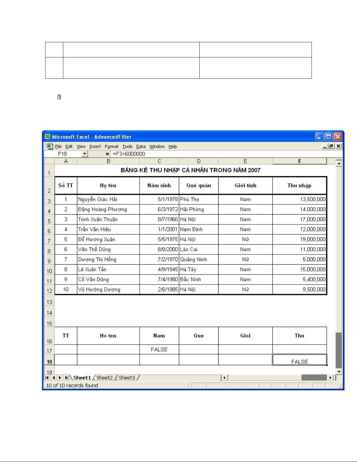 khung nhỏ để ghi thêm các điều kiện lọc. Giả sử ta chỉ muốn hiển thị trên bảng tính phân