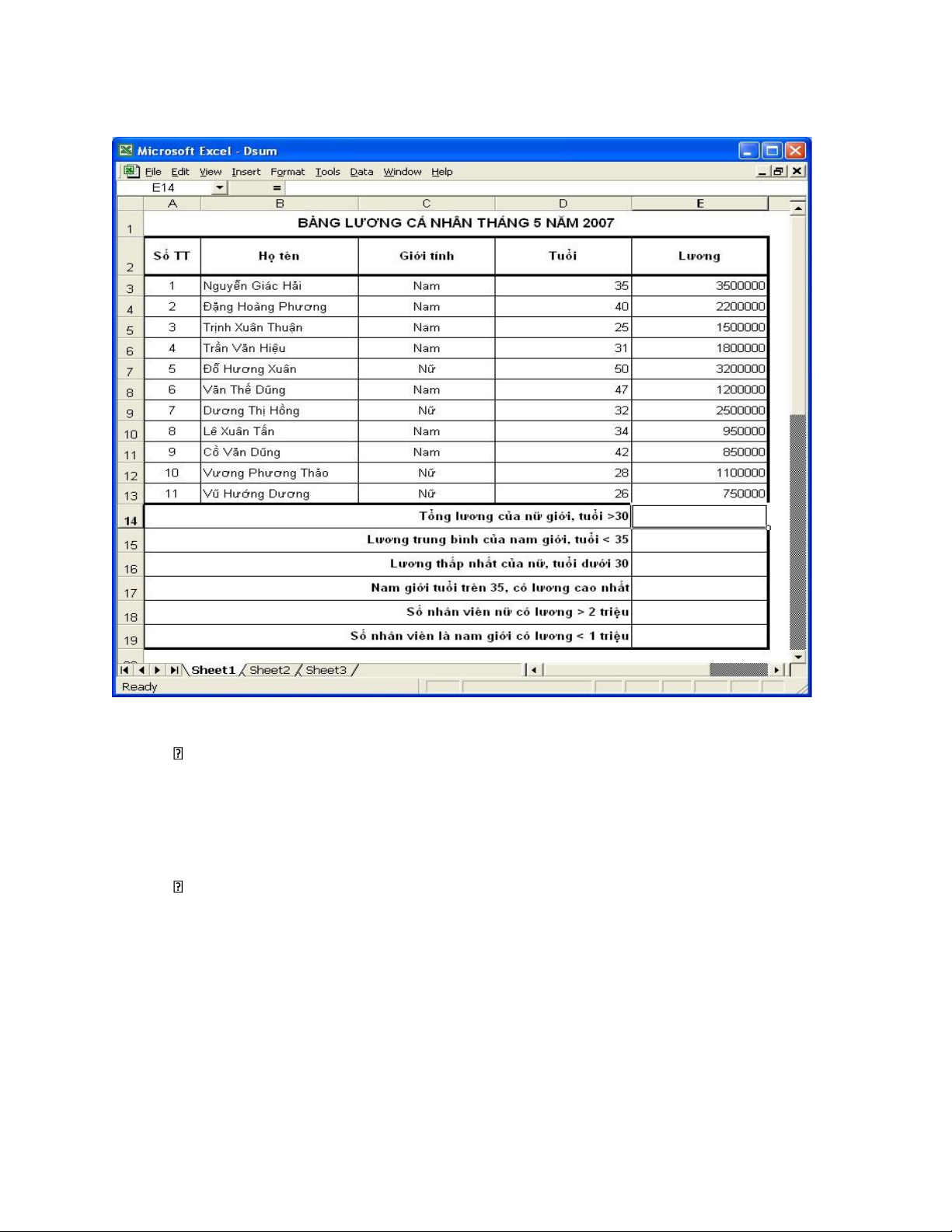 Ví dụ: Trong tháng 5 năm 2007 công ty CANHCAM có bảng lương như hình