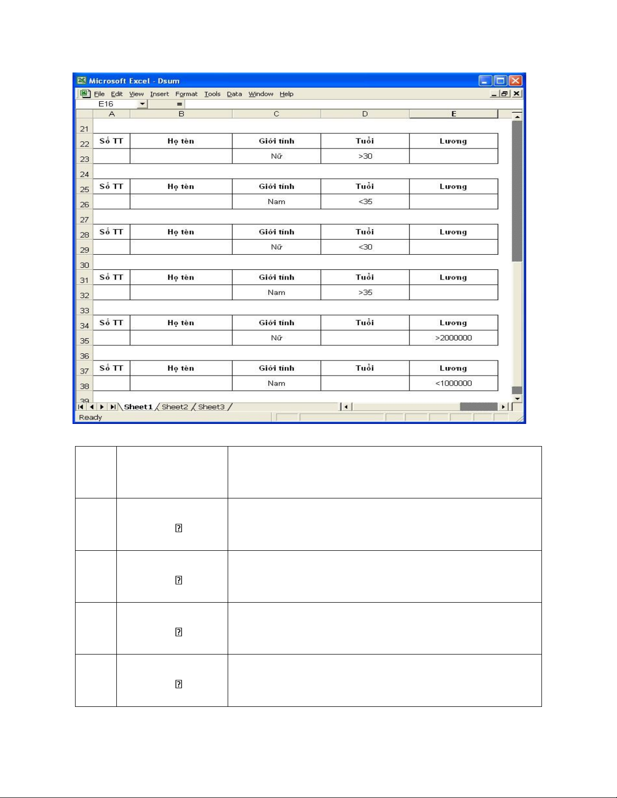 Lương cao nhất của nam giới trên 35 tuổi, ta thực hiện theo các bước sau: Các bước Thao tác Giải thích 1