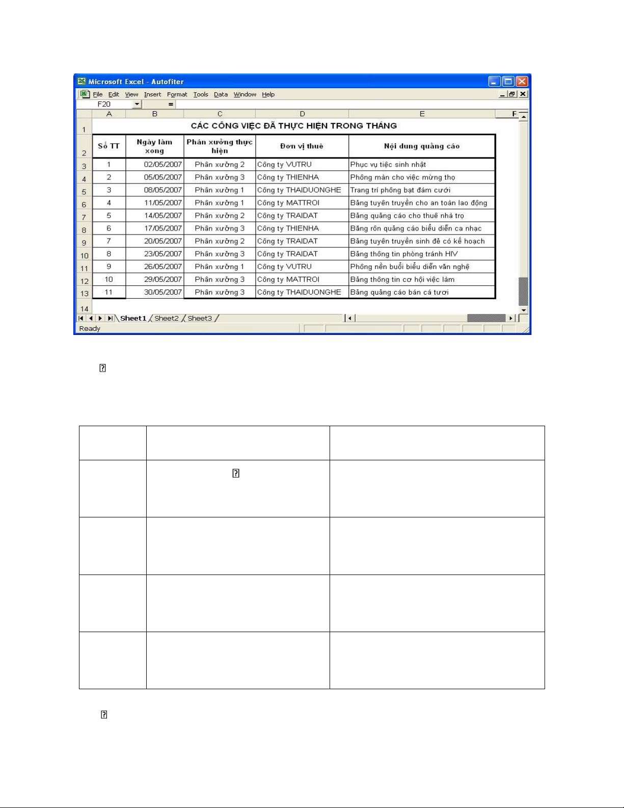 Ví dụ minh hoạ: Có bảng công việc thực hiện tại công ty quảng cáo BOCAP như