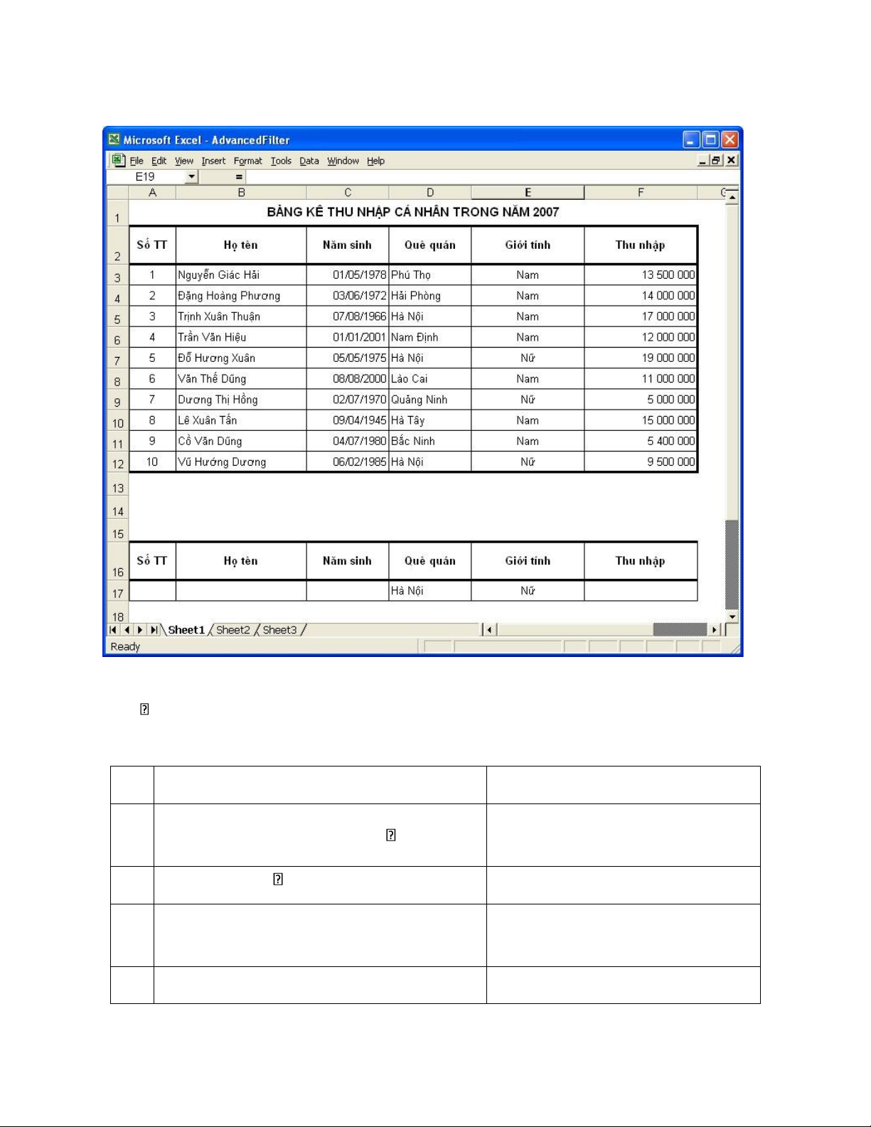 Hình 2.12: Minh hoạ cách sử dụng lọc Advanced Filter (vùng điều kiện trực tiếp)